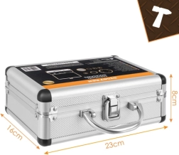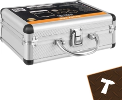 Zahvaljujući navoju M14 krunice se mogu koristiti na kutnoj brusilici; s priloženim adapterom također i u standardnoj bušilici. Konusni glodač 2–50 mm olakšava fazetiranje rubova, kalibraciju i precizno proširivanje otvora. Sve je pregledno pohranjeno u čvrstom aluminijskom transportnom koferu s pjenastim uloškom za siguran prijevoz.