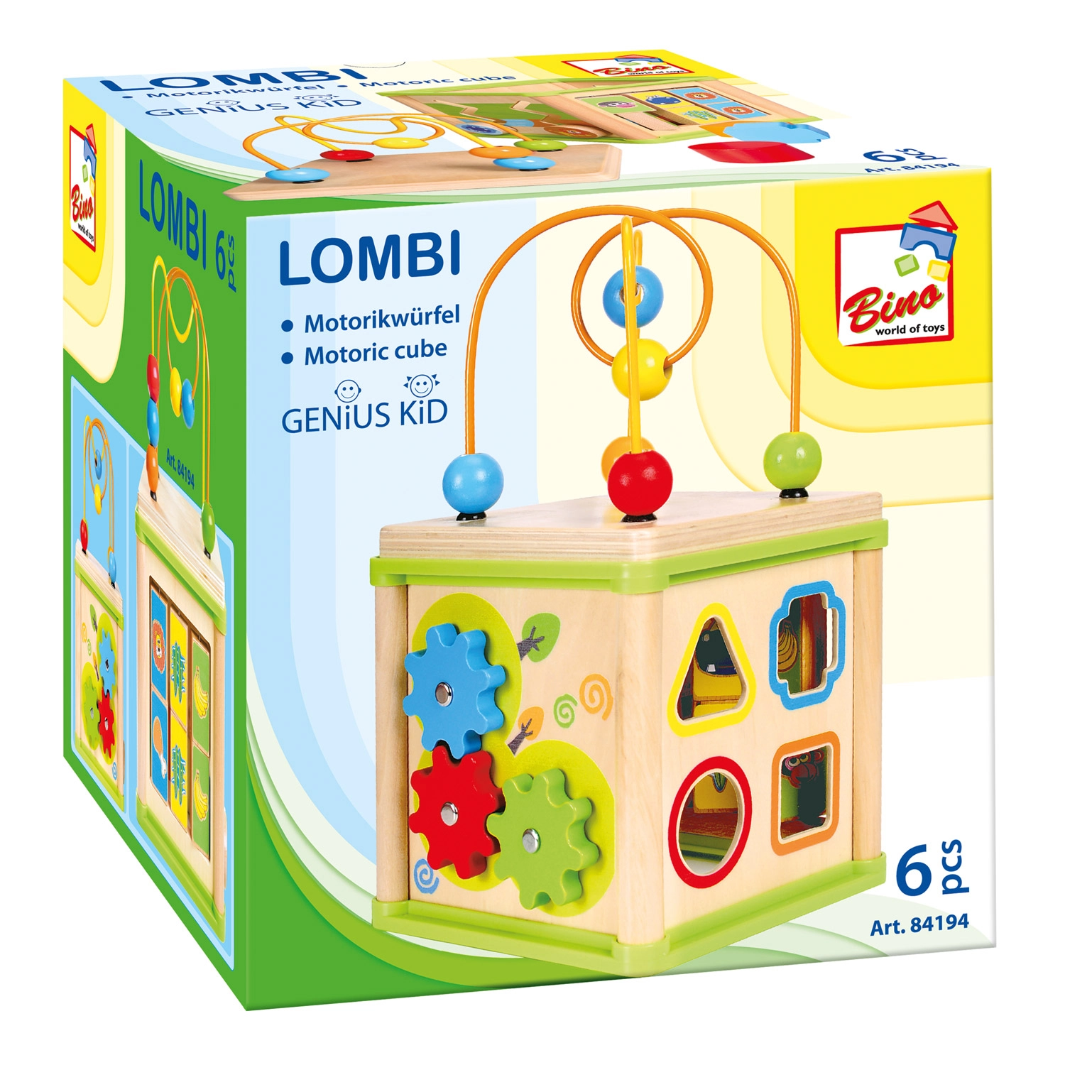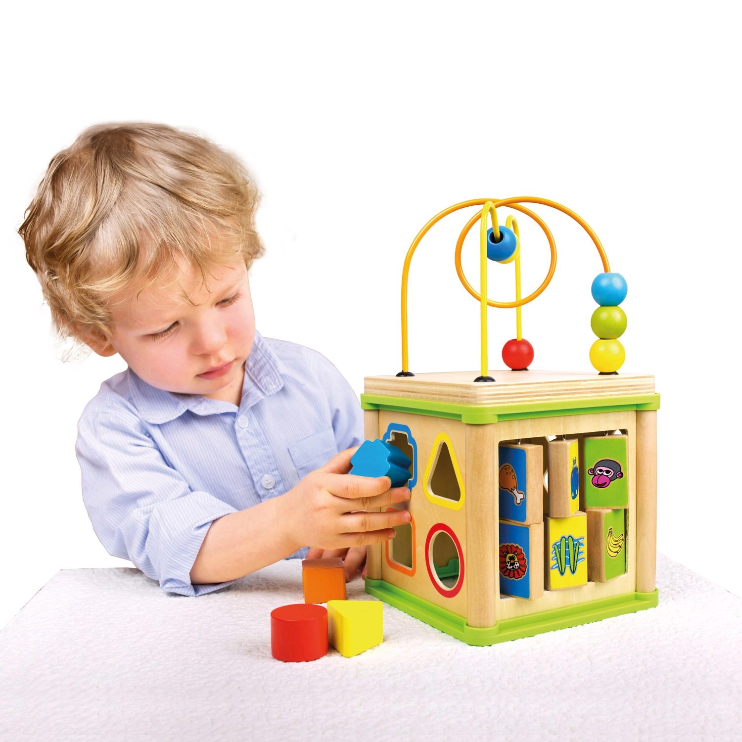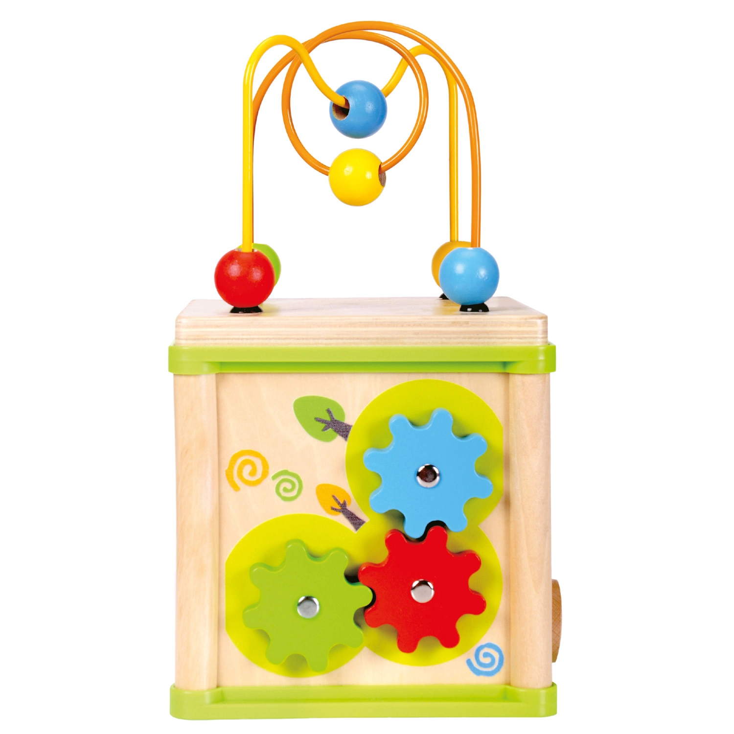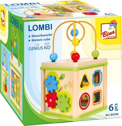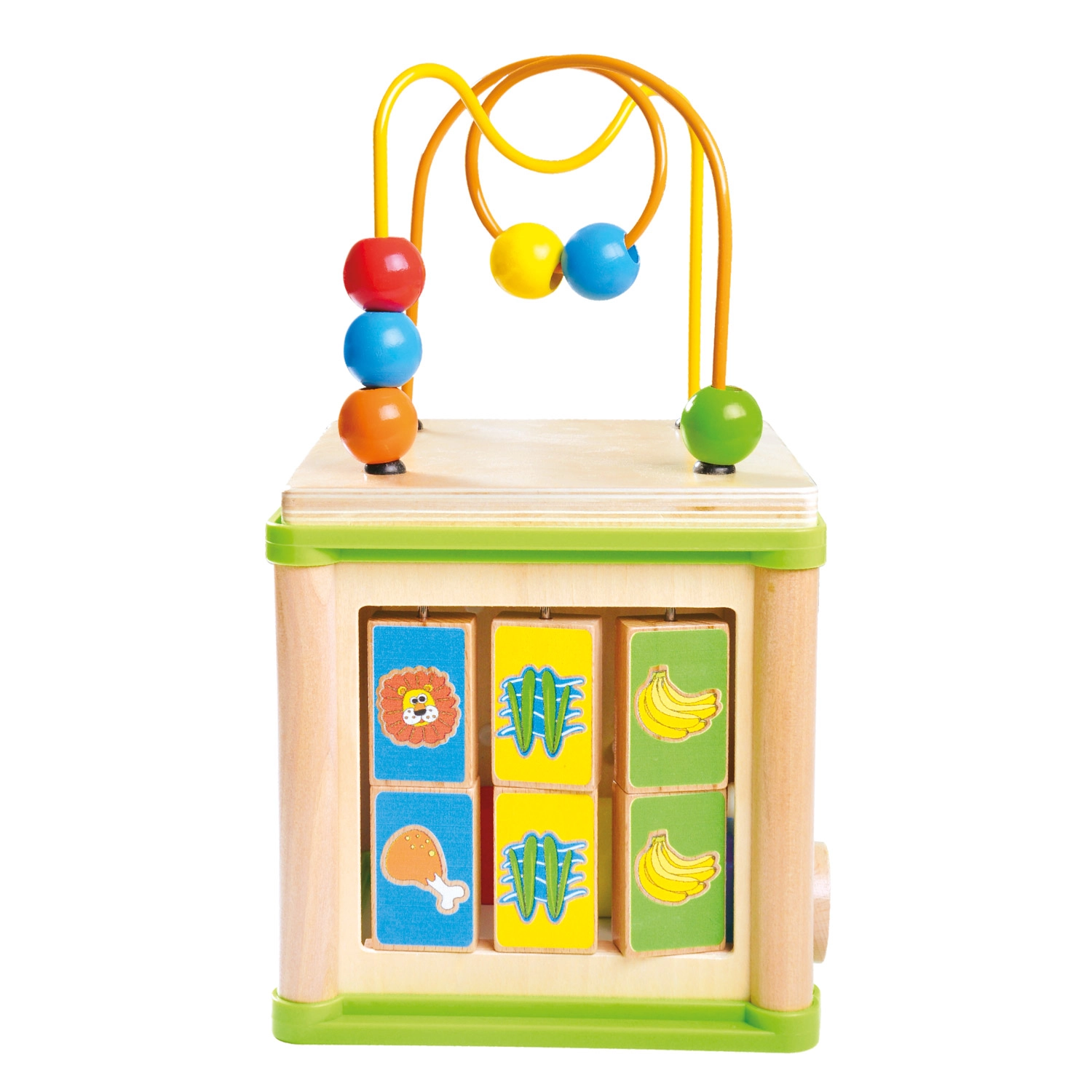 Ova svestrana drvena aktivna kocka kombinira pet atraktivnih igraćih elemenata u jednom kompaktnom izdanju. Djeca mogu povezivati životinje s njihovom hranom, provlačiti perlice po krivudavim stazama, istraživati funkciju zupčanika ili vježbati umetanje oblika. Gornji dio čini labirint s perlicama, koji potiče koordinaciju oko–ruka i usredotočenost.