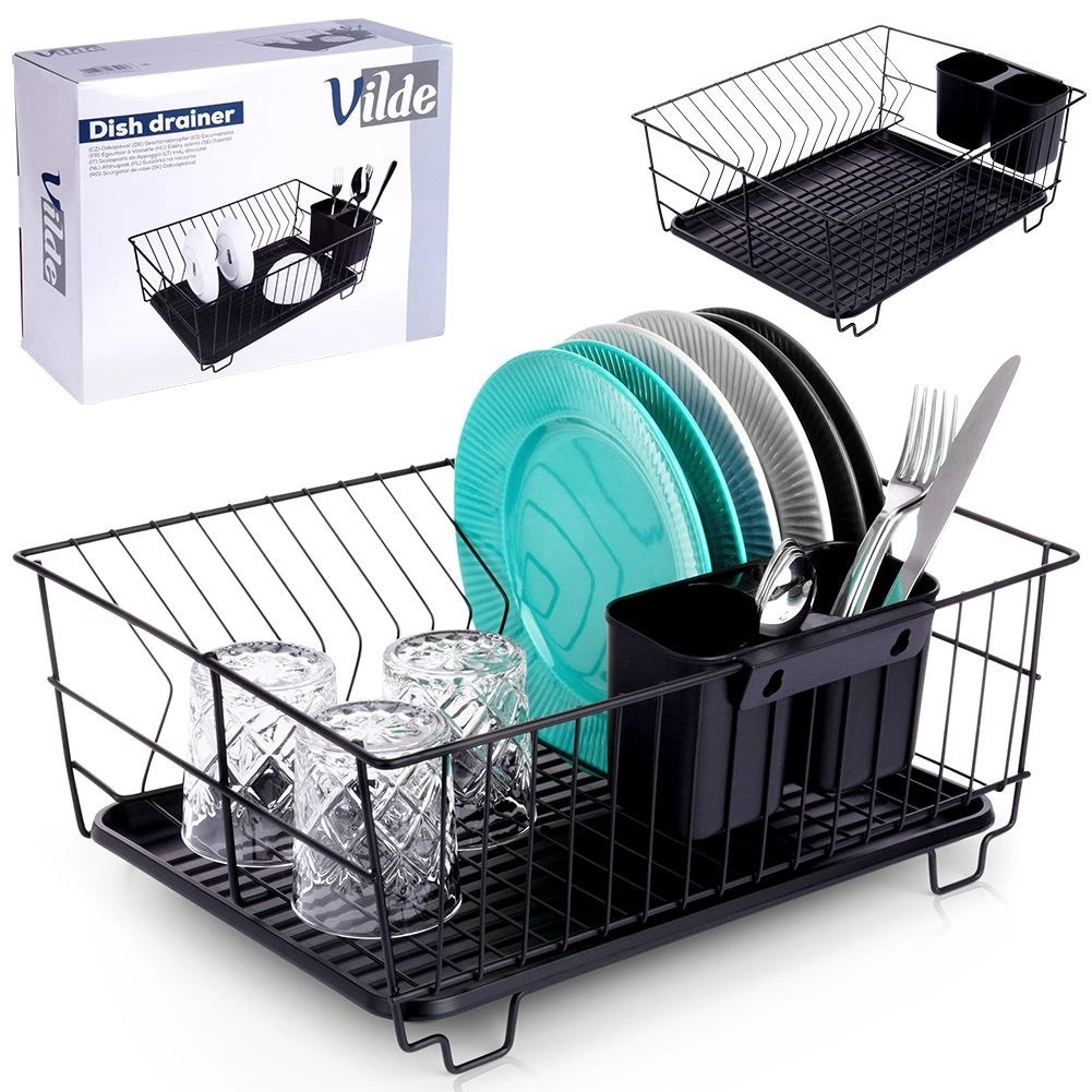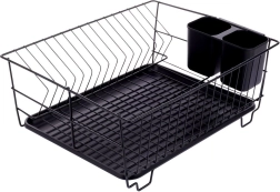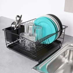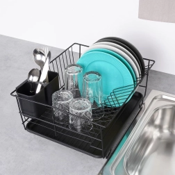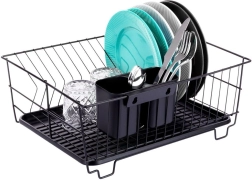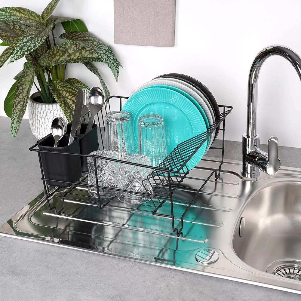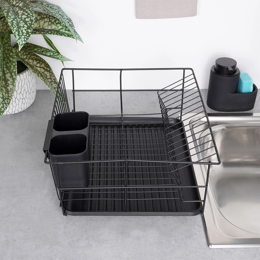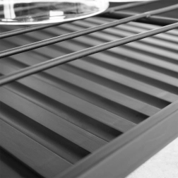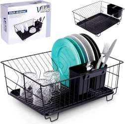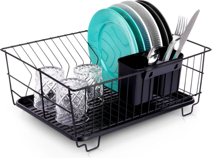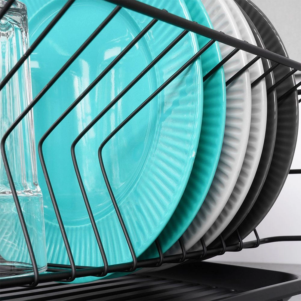 Stilski i funkcionalan ocjedivač za posuđe od izdržljivog metala u mat crnoj boji spaja moderan loft dizajn s praktičnošću za svaki dan. Pruža namjenske utore za do 15 tanjura i dovoljno prostora za čaše, zdjele i veće komade posuđa. Uklonjiva plastična ocjedna kada zadržava vodu i održava radnu plohu suhom.