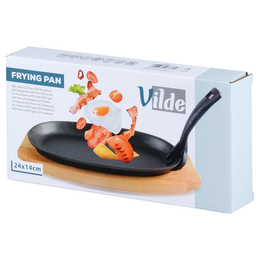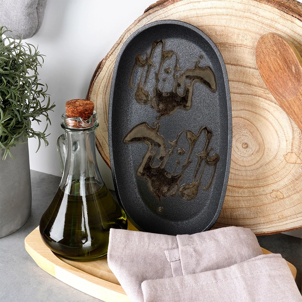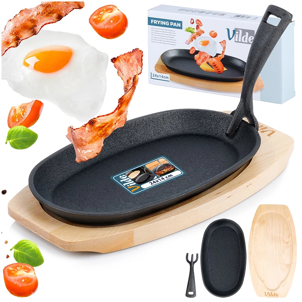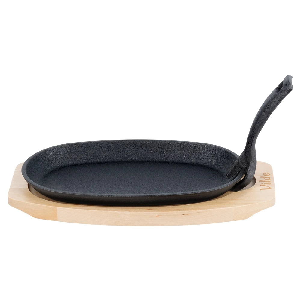 Ova ovalna posuda od lijevanog željeza dimenzija 24 × 14 × 2 cm s odvojivom ručkom i masivnom drvenom daskom (28 × 19 cm) idealna je za roštiljanje, prženje, pečenje i posluživanje. Lijevano se željezo zagrijava ravnomjerno i odlično zadržava toplinu, pa meso, povrće ili krumpir ostaju sočni i lijepo vrući i pri posluživanju.