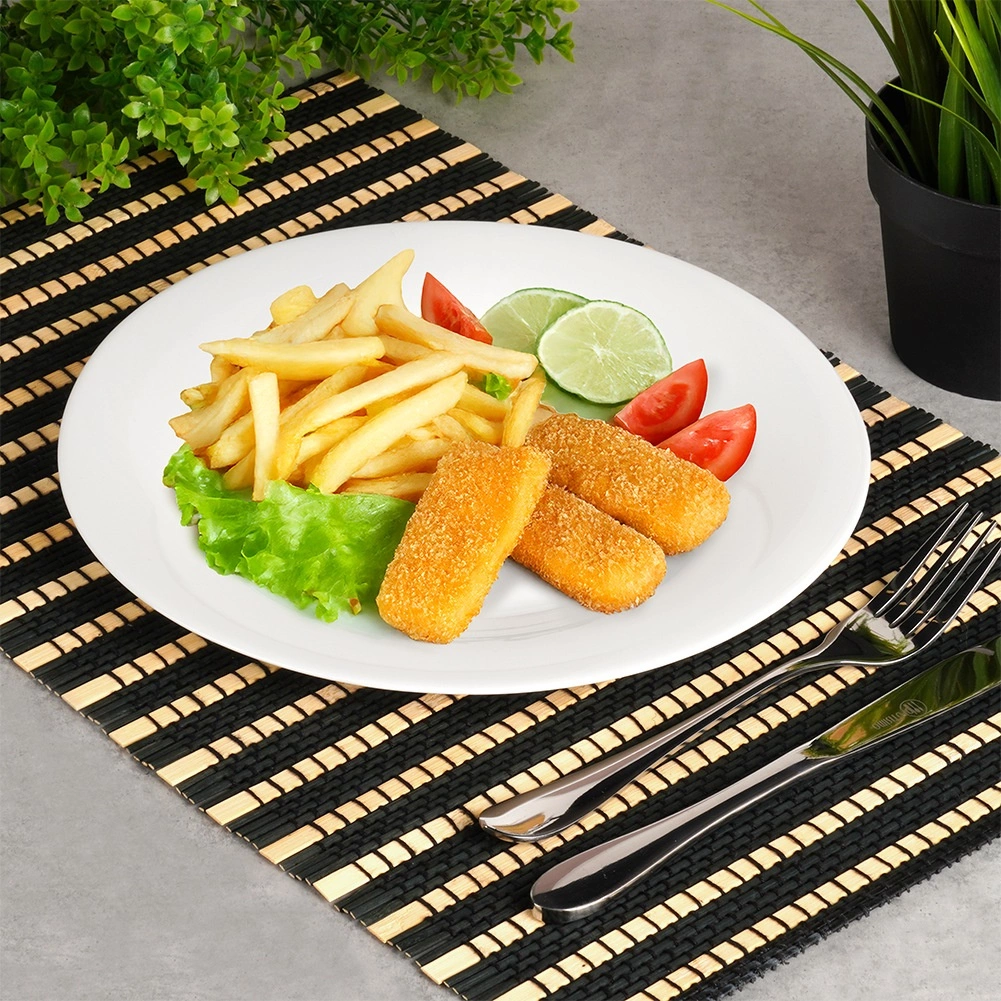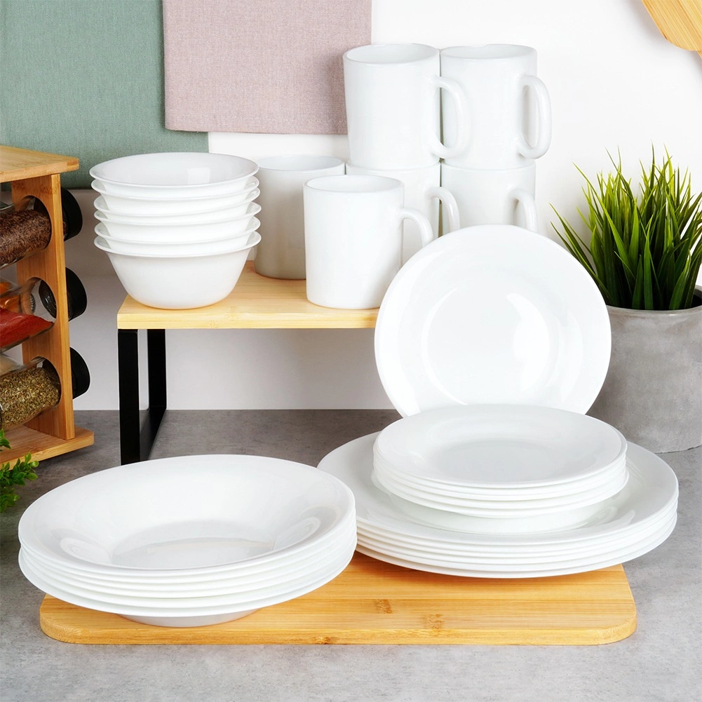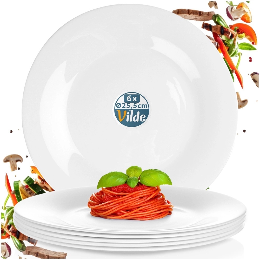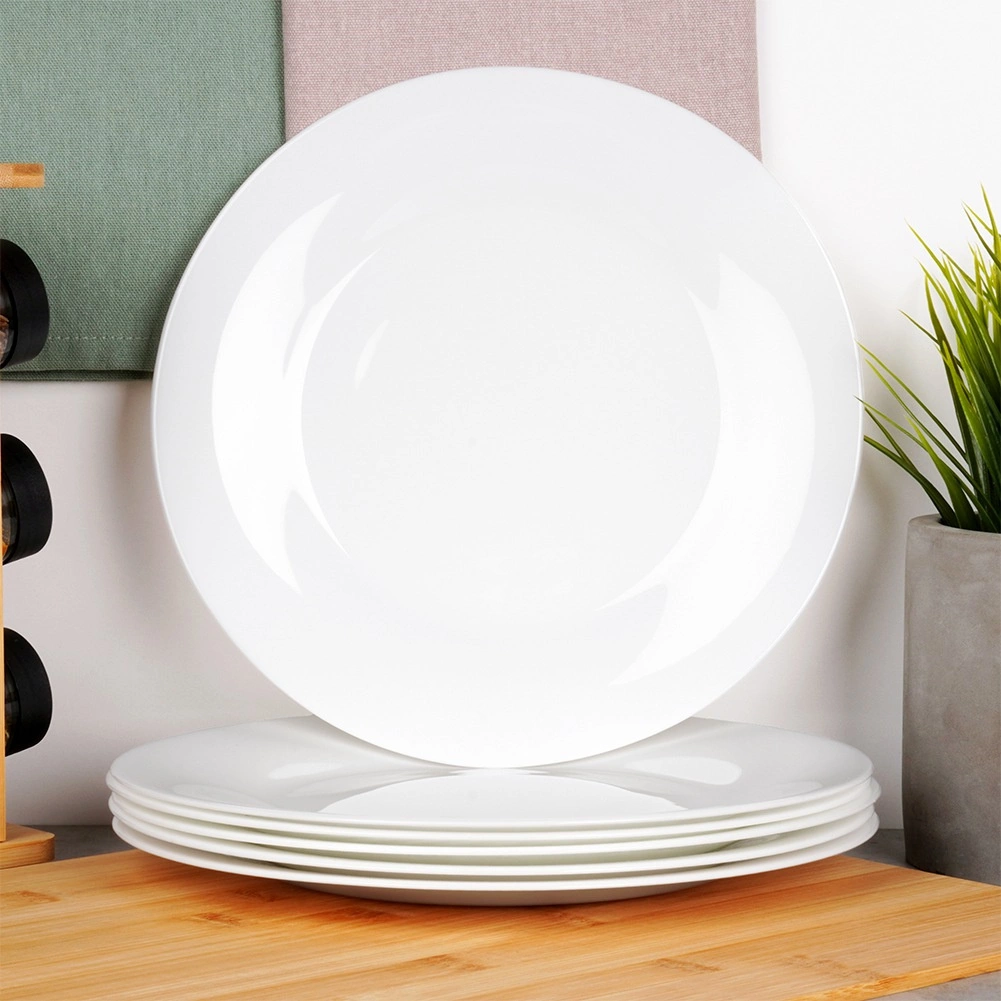 Elegantni set od 6 plitkih tanjura promjera 25,5 cm od izdržljivog opalnog stakla u bijeloj boji. Idealan za svakodnevno posluživanje i svečani stol. Tanjuri su lagani, otporni na toplinu do +100 °C, prikladni za perilicu posuđa i mikrovalnu pećnicu. Minimalistički dizajn lako se kombinira s bilo kojom opremom stola.