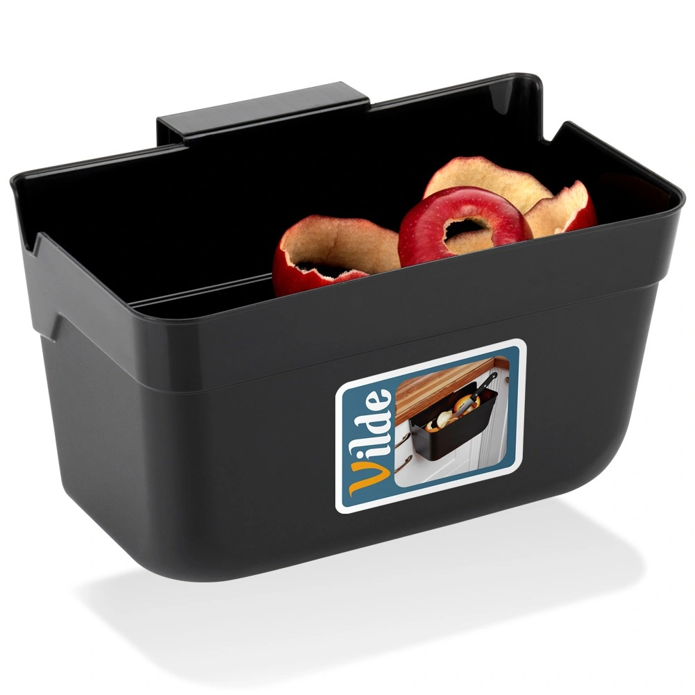 Praktična viseća kanta za vrata kuhinjskog ormarića ili ladicu ispod radne ploče za brzo odlaganje kora i ostataka tijekom kuhanja. Ima zapremninu 2,5 l i dimenzije 22,5 × 15 × 13,5 cm. Izrađena od kvalitetne plastike u crnoj boji, lako se čisti i zahvaljujući čvrstoj kuki sigurno stoji na rubu vrata. Održava red na kuhinjskoj radnoj plohi, štedi vrijeme pri čišćenju i idealna je za biootpad.