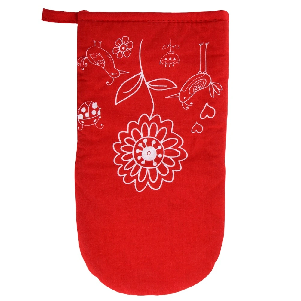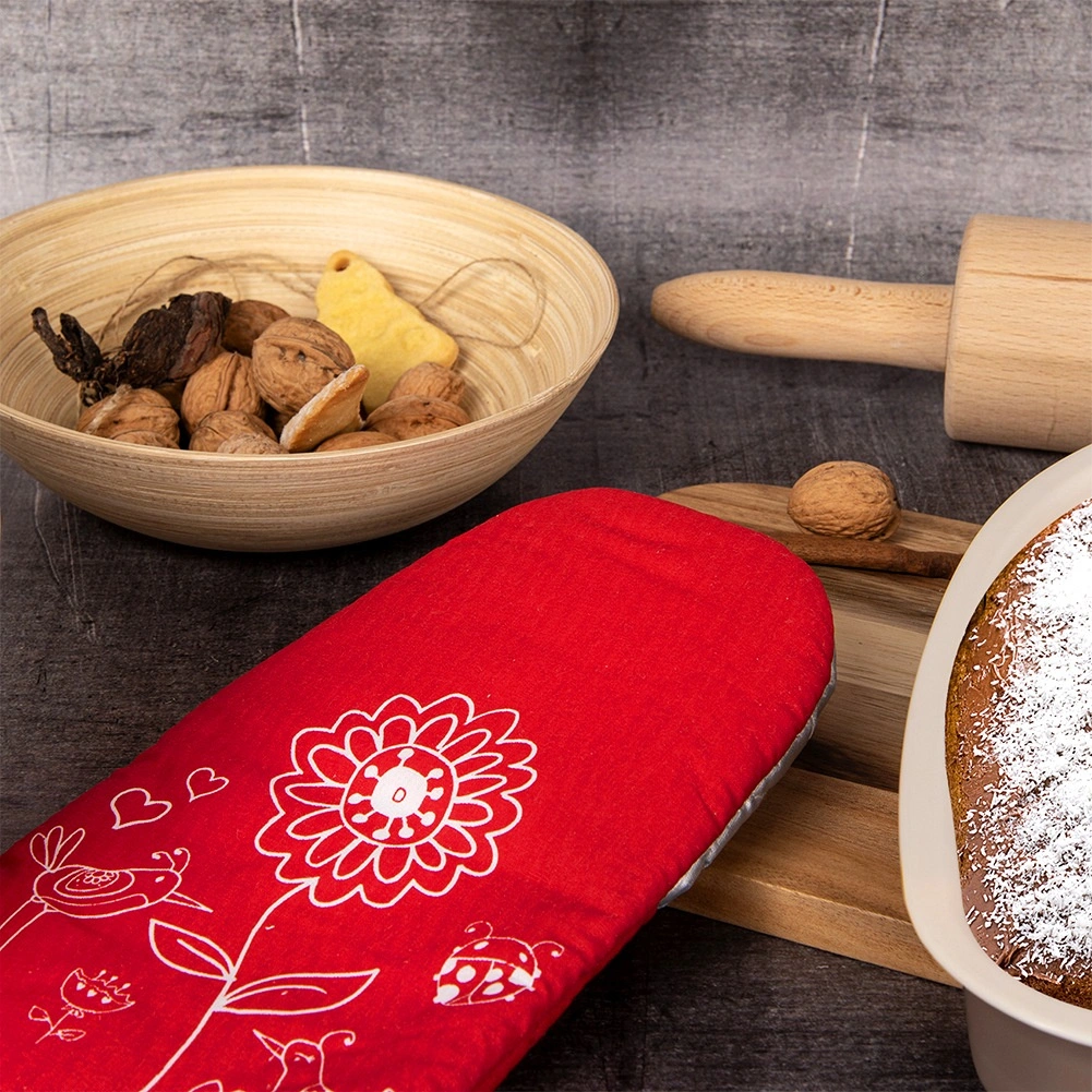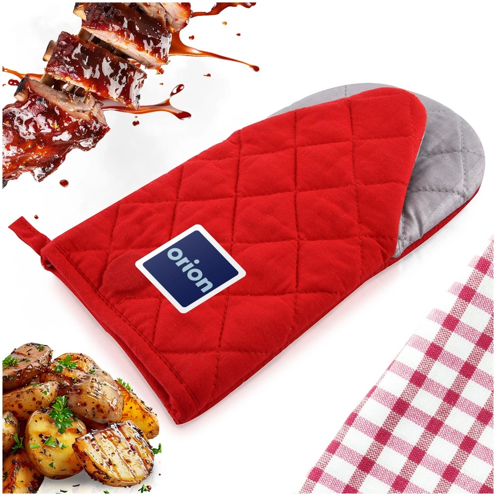 Ova crvena kuhinjska rukavica spaja atraktivan izgled s visokom funkcionalnošću. Vanjski dio od izdržljivog poliestera nadopunjuje pamučna hvatna površina s teflonskom površinskom obradom, koja osigurava pouzdanu toplinsku zaštitu pri kuhanju i pečenju. Rukavica dobro prianja uz ruku i olakšava sigurno prenošenje vrućih limova, pekača i lonaca.