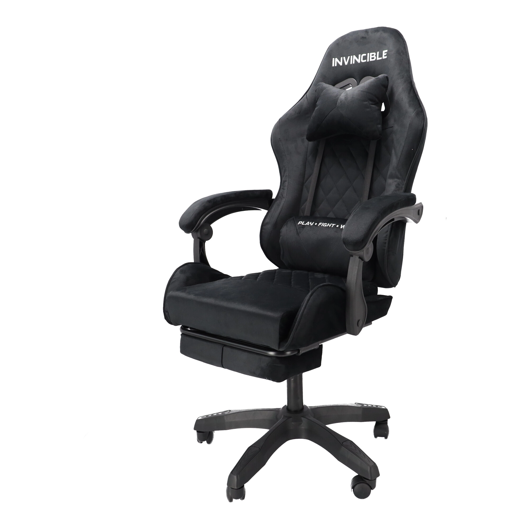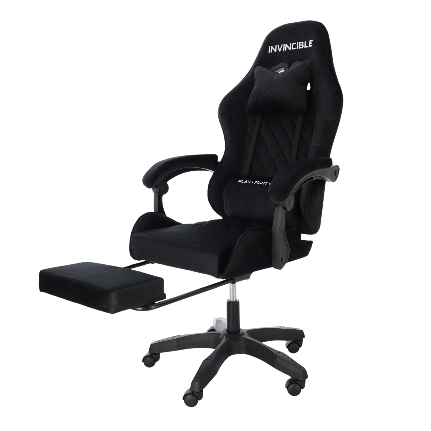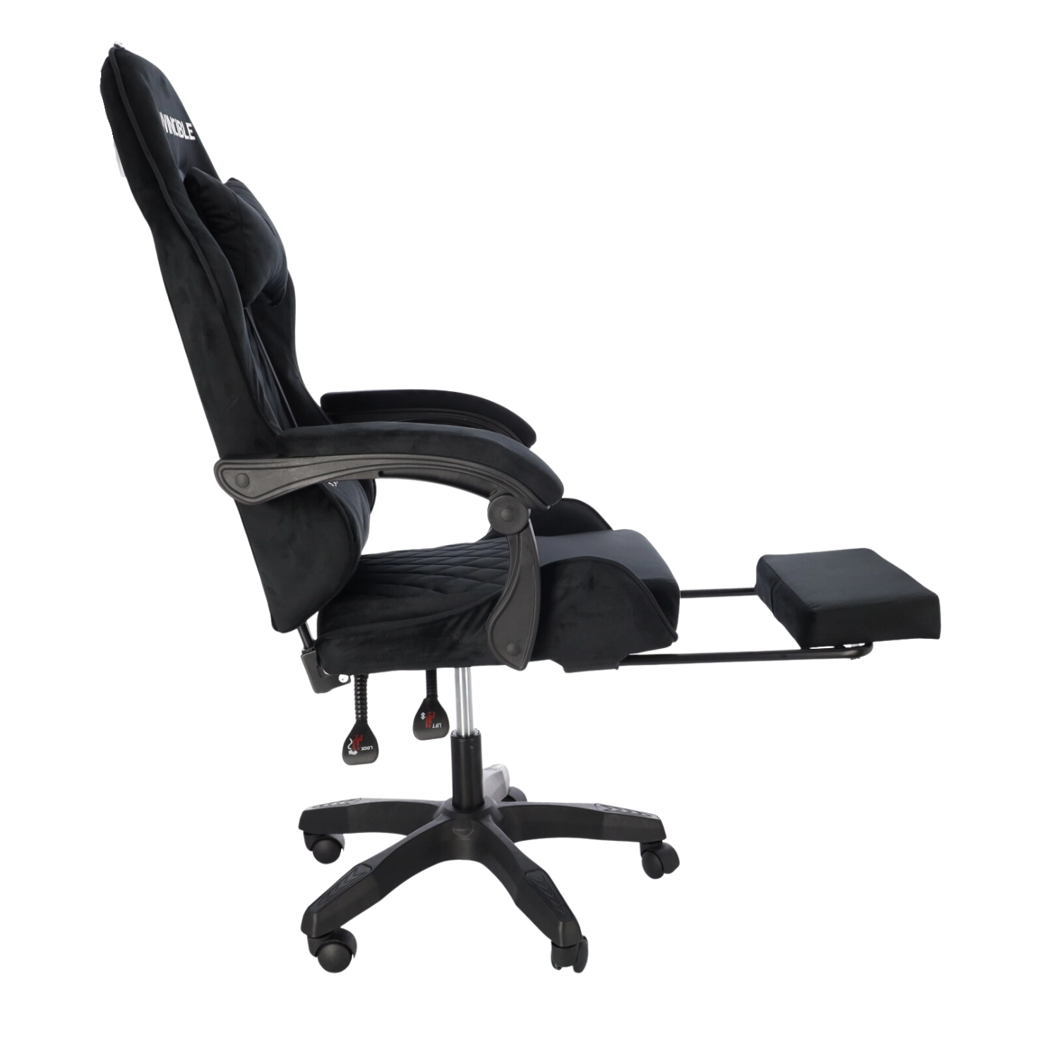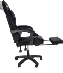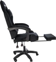 Stilska gaming stolica s presvlakom od crnog velura spaja udobnost i elegantan izgled. Ergonomski oblikovan naslon, jastuk za vrat i lumbalna potpora podupiru pravilno držanje tijela. Zahvaljujući podešavanju visine, nagibu do 145°, okretanju za 360° i izvlačivom osloncu za noge lako ćete pronaći idealan položaj za igranje, rad i odmor. Stabilna petokraka baza na kotačićima osigurava glatko kretanje i nosivost 130 kg.