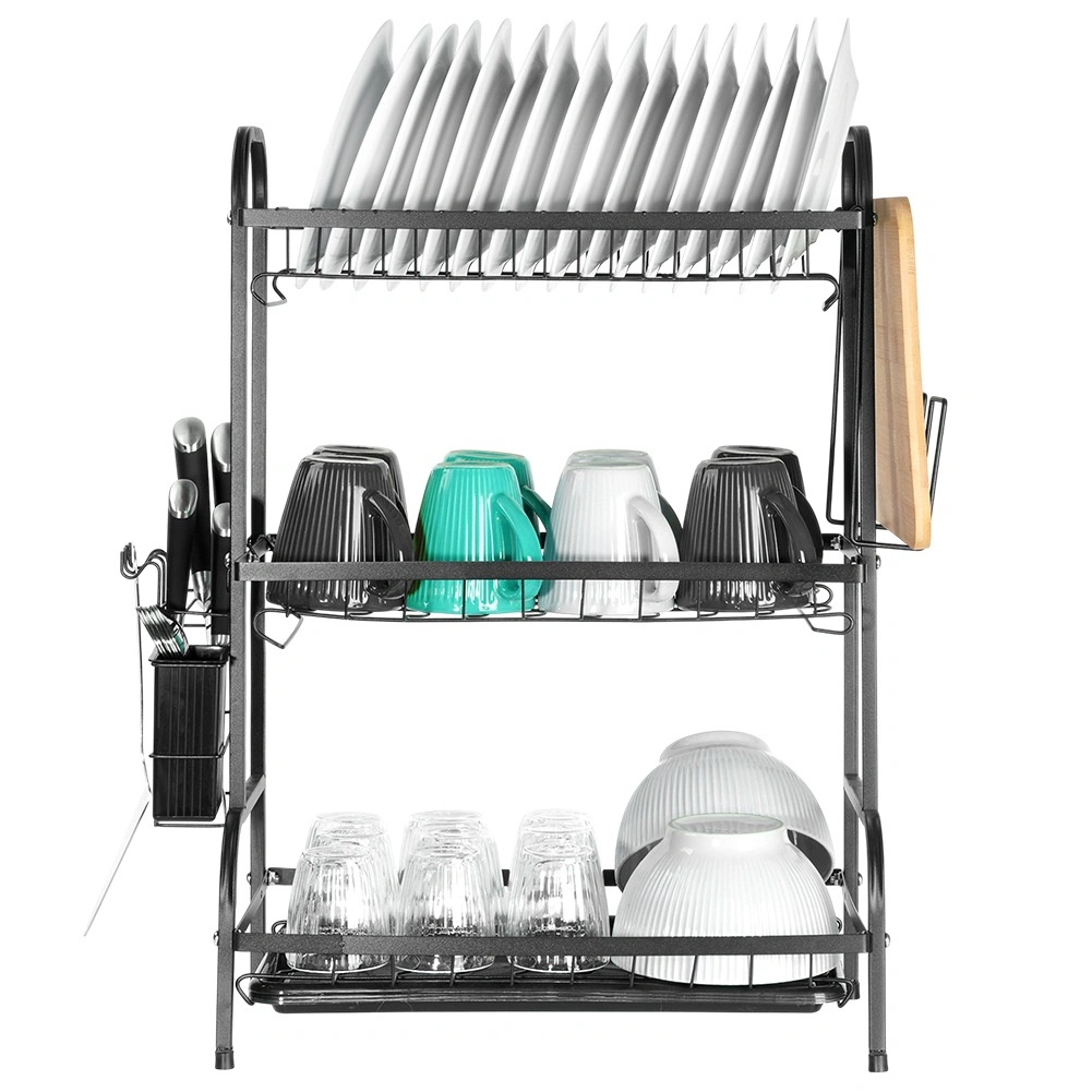 Maksimizirajte prostor uz sudoper s trokatnim crnim ocjedom od izdržljivog metala. Gornja razina prima do 16 tanjura, a donje su idealne za zdjele, čaše i šalice. Odvojiva posudica za pribor i bočni držač za dasku proširuju površinu za sušenje, dok izvadiva posuda za ocjeđivanje hvata vodu i održava ploču suhom.