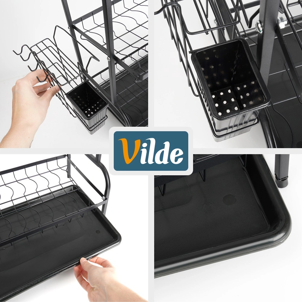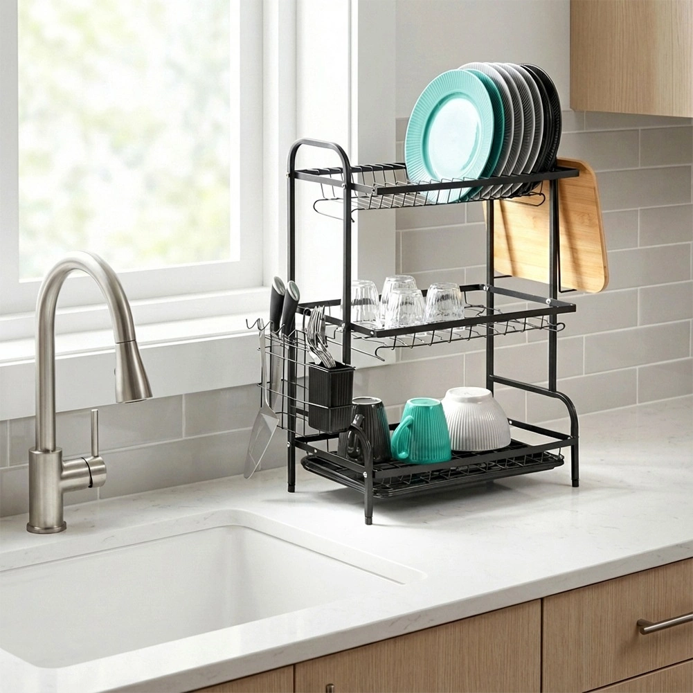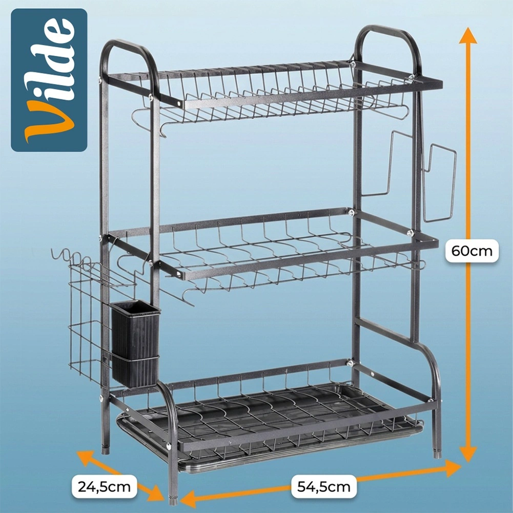 Trokatno metalno ocjedalo za posuđe u elegantnoj crnoj boji štedi prostor i održava kuhinju urednom. Nudi veliki kapacitet, čvrstu i izdržljivu konstrukciju, odvojivu posudicu za pribor i držač za dasku. Praktična posuda za ocjeđivanje štiti radnu plohu od vode i olakšava održavanje.
