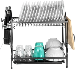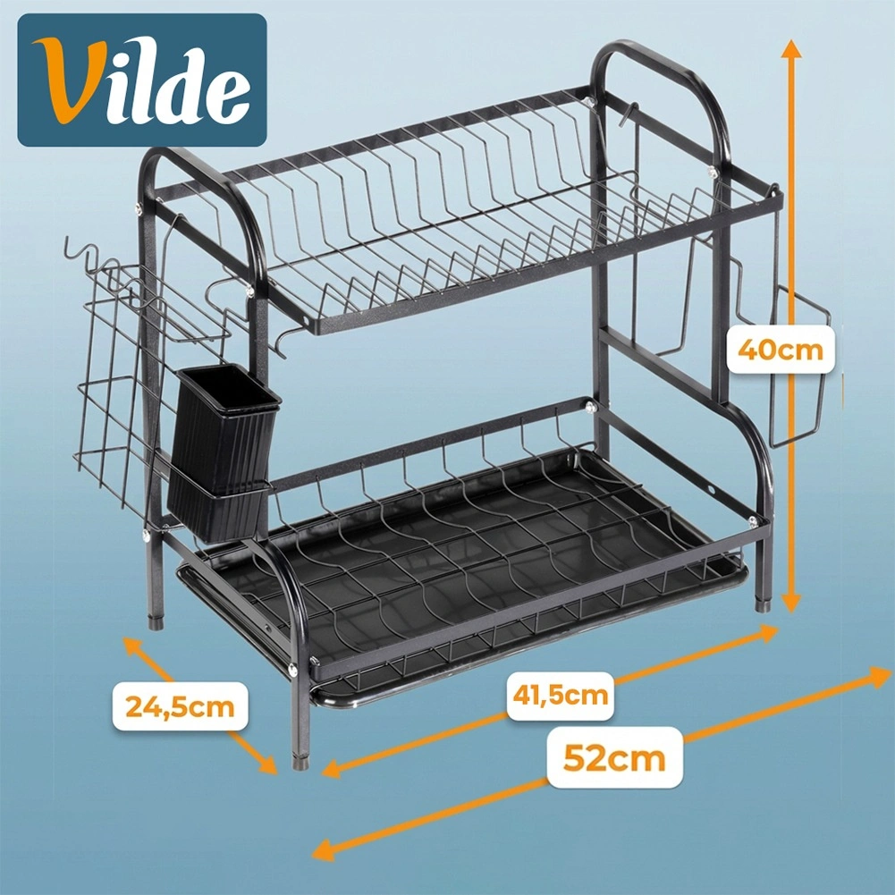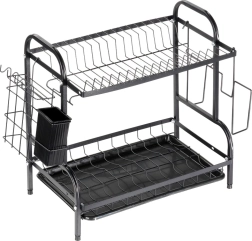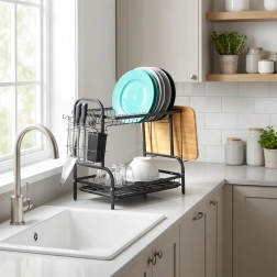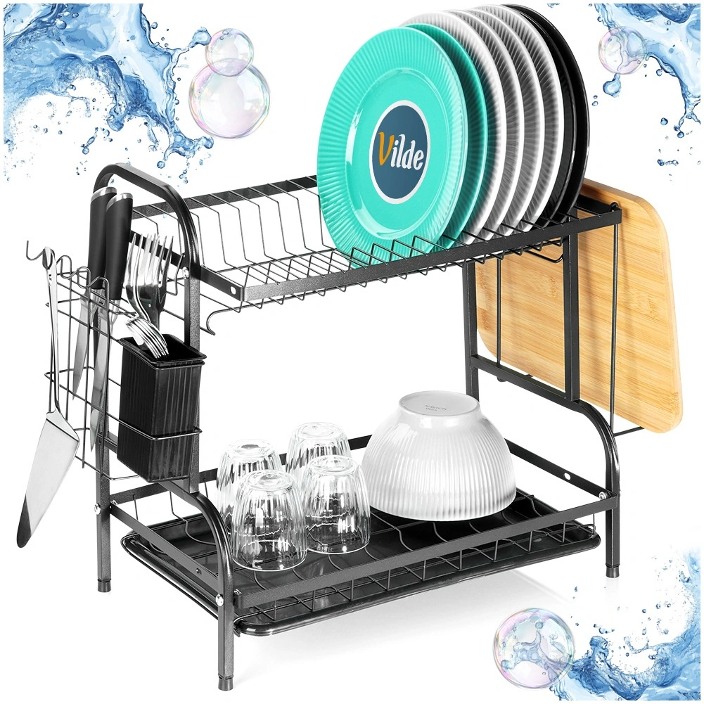 Praktična dvoslojna ocjedna za posuđe u elegantnoj crnoj boji štedi prostor na radnoj plohi i ubrzava sušenje. Nudi gornji stalak za tanjure, donji prostor za zdjele i čaše, bočni držač za dasku za rezanje te izvadivu košaricu za pribor za jelo. Zahvaljujući plastičnoj ocjednoj tacni kuhinjska ploha ostaje suha i čista. Izrađeno od izdržljivog metala za dug vijek trajanja i lako održavanje. Idealno za moderne i klasične kuhinje – stilski loft dizajn, velik kapacitet i učinkovita organizacija svakodnevnog pranja posuđa.
