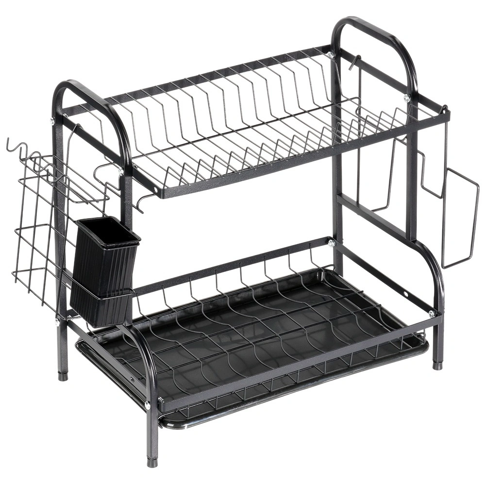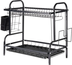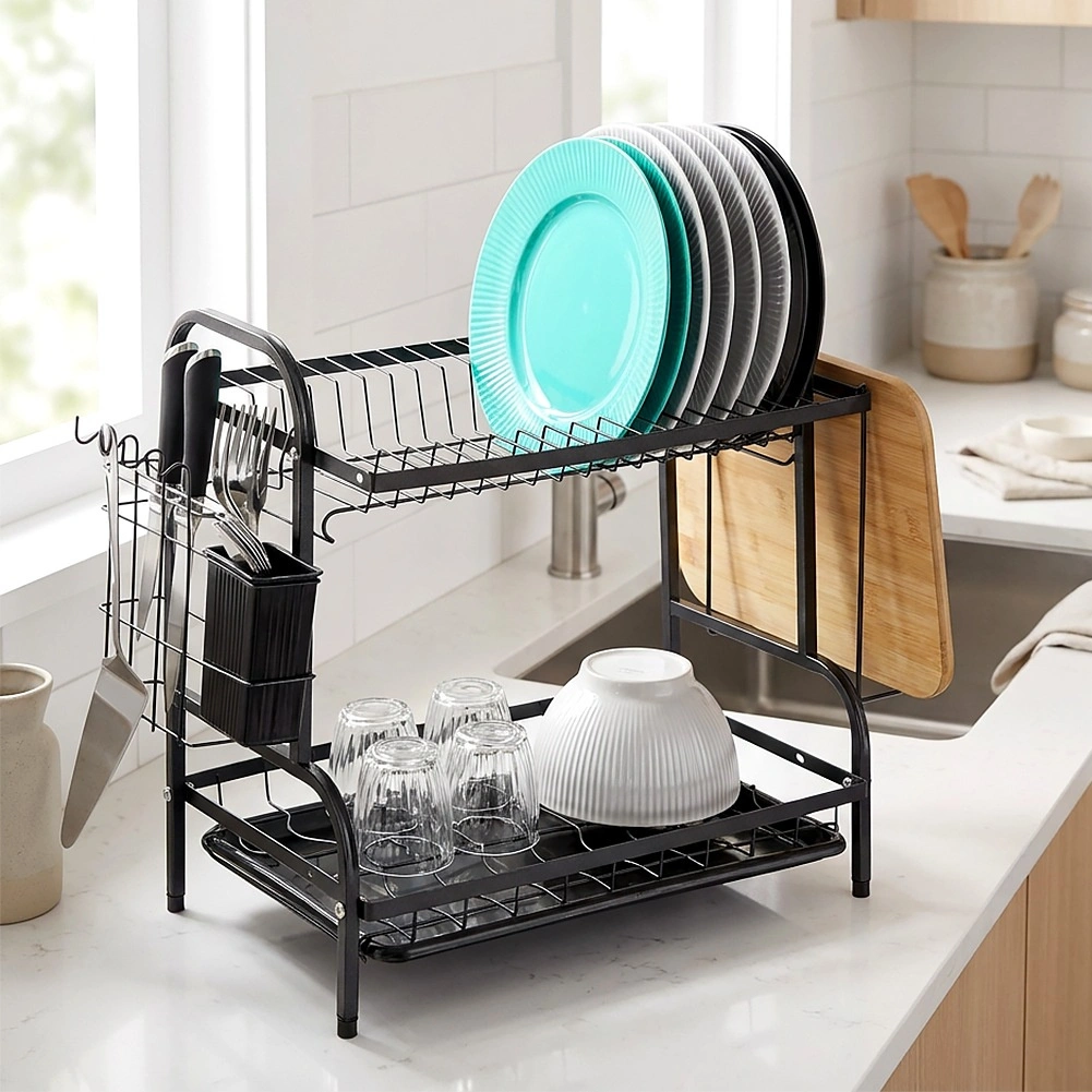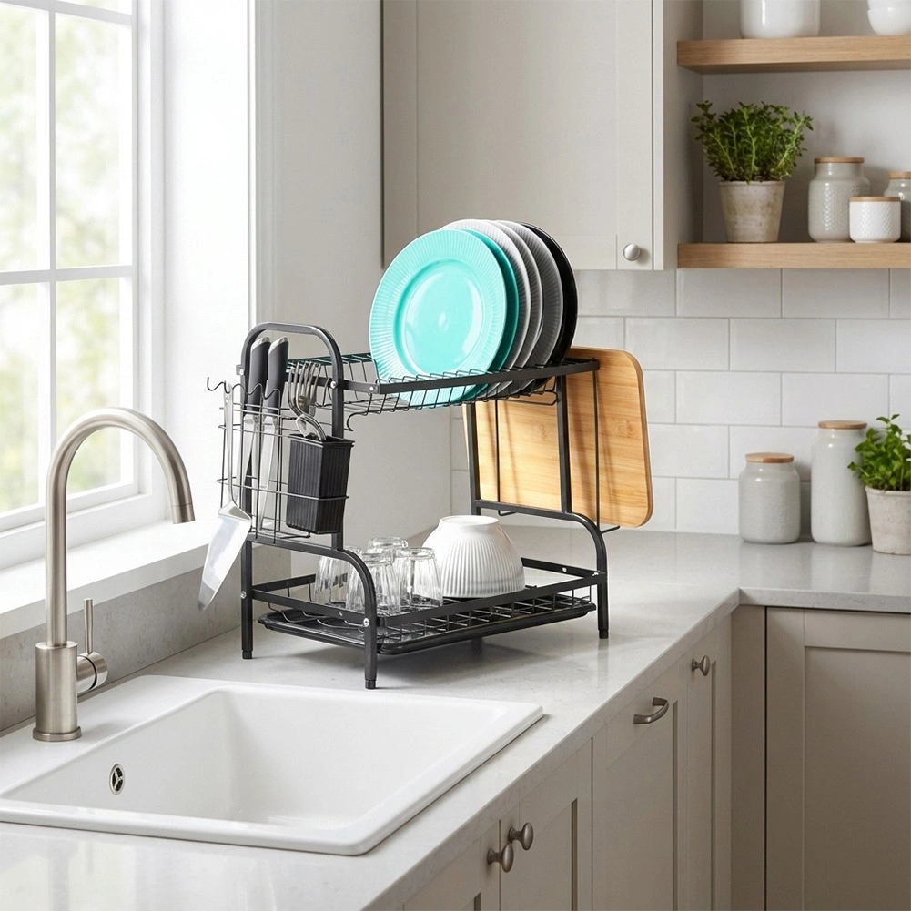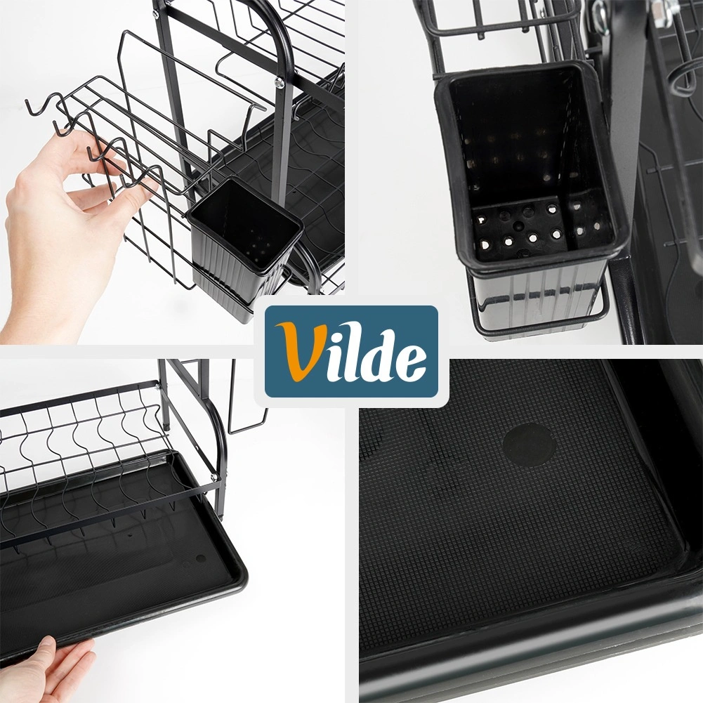 Robusna metalna konstrukcija u mat crnoj izvedbi je izdržljiva i laka za održavanje. Donja ocjedna tacna od plastike skuplja vodu i štiti kuhinjsku plohu od mrlja. Cijelo rješenje idealno je za manje kuhinje i domove koji žele da posuđe uvijek bude uredno organizirano.