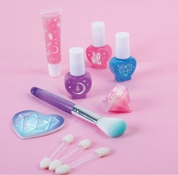 Sadrži kozmetičku torbicu sa svjetlom i ogledalom, 12 različito obojenih sjenila za oči, 3 kista za sjenilo, 2 rumenila, kist za rumenilo, 3 različito obojena laka za nokte, sjajilo za usne, balzam za usne, turpiju za nokte i upute. Prikladno za djecu od 8 godina.