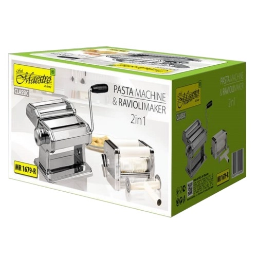 Otkrijte pripremu domaće tjestenine s ručnim strojem 3u1 Maestro MR-1679R od nehrđajućeg čelika. Lako razvaljajte ploče za lasagne, narežite rezance 2 mm i 6,5 mm i zahvaljujući nastavku za ravioli (4,5 × 4,5 cm) izradite ujednačene jastučiće. Nudi 9 razina debljine (0,3–3 mm) i širinu tijesta do 14,5 cm za savršen rezultat.