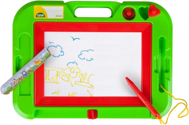 Dječja magnetna crtaća ploča marke LENA potiče kreativnost i finu motoriku. U kompletu su olovka na vezici, 2 magnetska žiga i klizač za brzo brisanje, zahvaljujući kojem djeca lako mogu ponovno početi crtati. Pri pisanju metalnim vrhom obojena površina se mijenja i stvara žive slike.