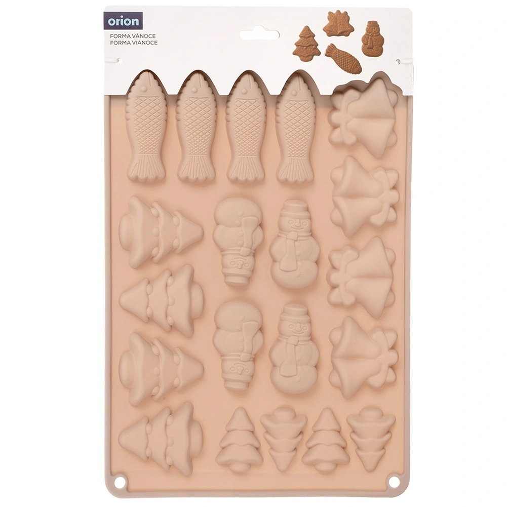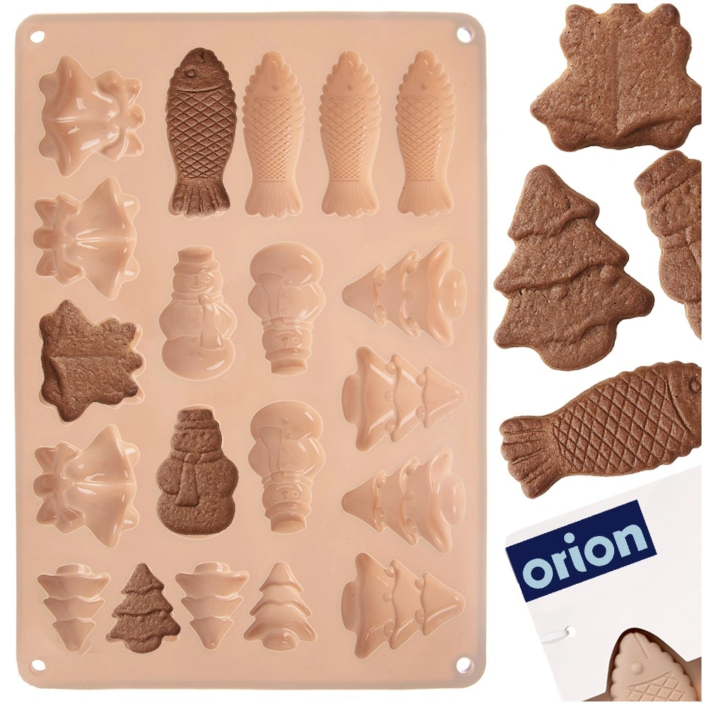 Ovaj bež silikonski kalup dimenzija 34 × 24,5 × 1 cm idealan je za izradu božićnih keksa, medenjaka, čokoladica i pralina. Visokokvalitetni silikon jamči lako vađenje bez lijepljenja te ravnomjerno pečenje ili stvrdnjavanje. Iz jedne ture pripremite do 20 komada u 5 različitih oblika.