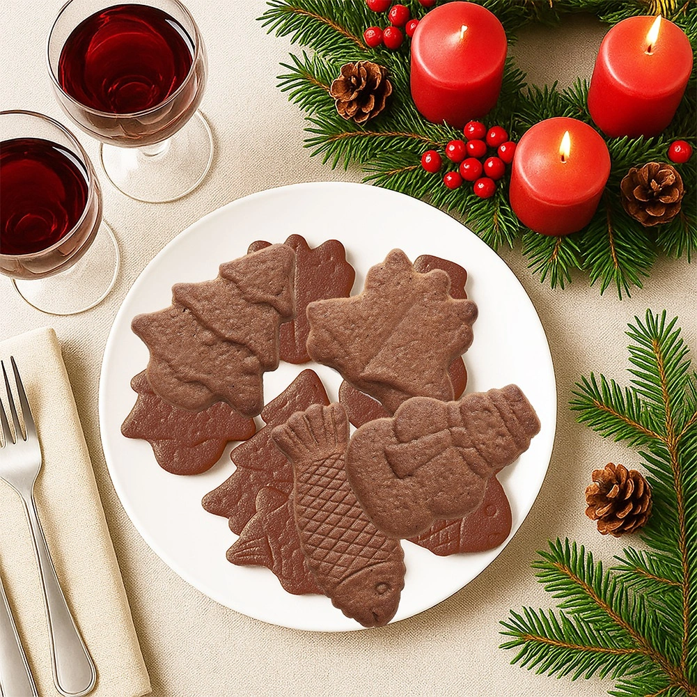 Kalup nudi jelke u dvije veličine, snjegovića, zvona i ribu – idealno za kekse i čokoladice sa svečanim izgledom.