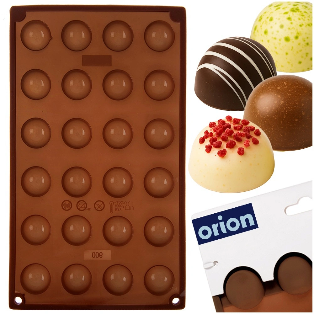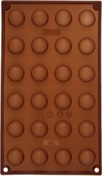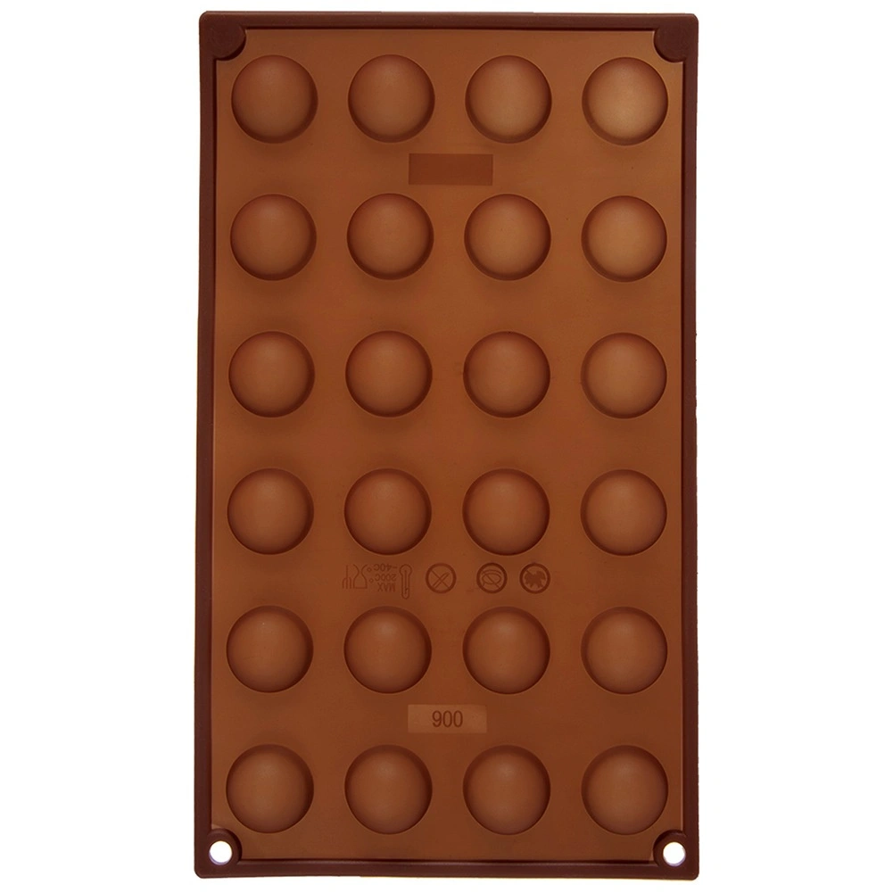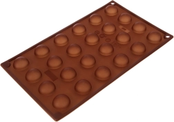 Ovaj smeđi silikonski kalup dimenzija 30 × 17,5 × 1,5 cm omogućuje pripremu elegantnih polukuglastih pralina, čokoladica ili malih deserata promjera oko 2,8 cm. Zahvaljujući elastičnom materijalu slastice se lako istresaju i zadržavaju savršen oblik bez lijepljenja.