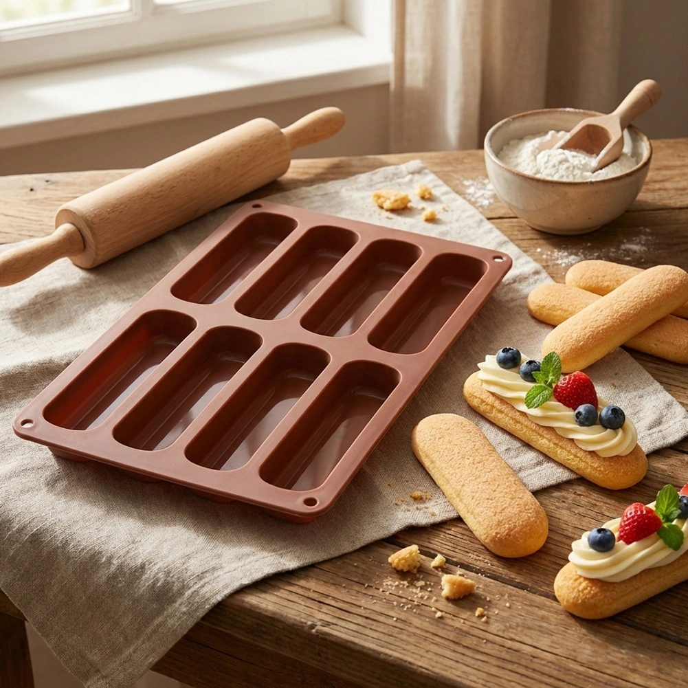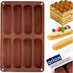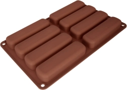 Ovaj smeđi silikonski kalup idealan je za ravnomjerno pečenje izduženih piškota uvijek istog oblika i veličine. Zahvaljujući fleksibilnom materijalu, gotovi komadi lako se vade, a kalup se jednostavno održava. Odličan je za pripremu tiramisua, deserata u čašama i laganih piškotnih keksa.