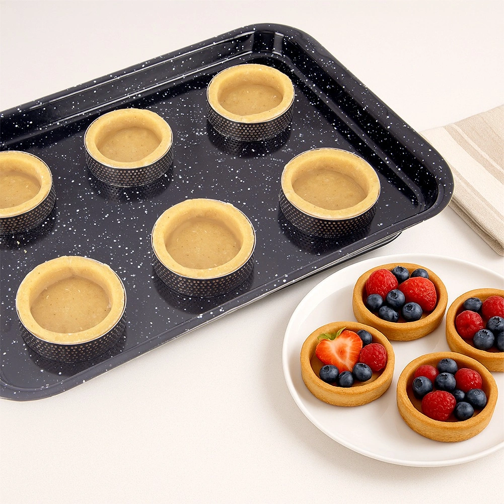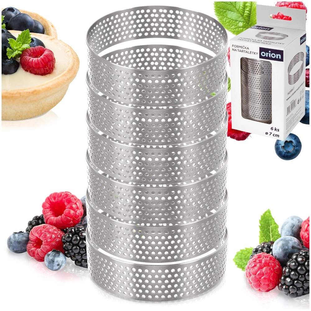 Praktičan set od 6 perforiranih obruča za tartlete promjera 7 cm i visine 2 cm za ujednačeno pečenje, hrskave podloge i lako vađenje bez podmazivanja. Nerđajući čelik osigurava izdržljivost i postojanost oblika, a perforacija podržava odvod pare i savršeno pečenje slatkih i slanih tartleta. Pogodno za perilicu posuđa.