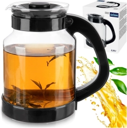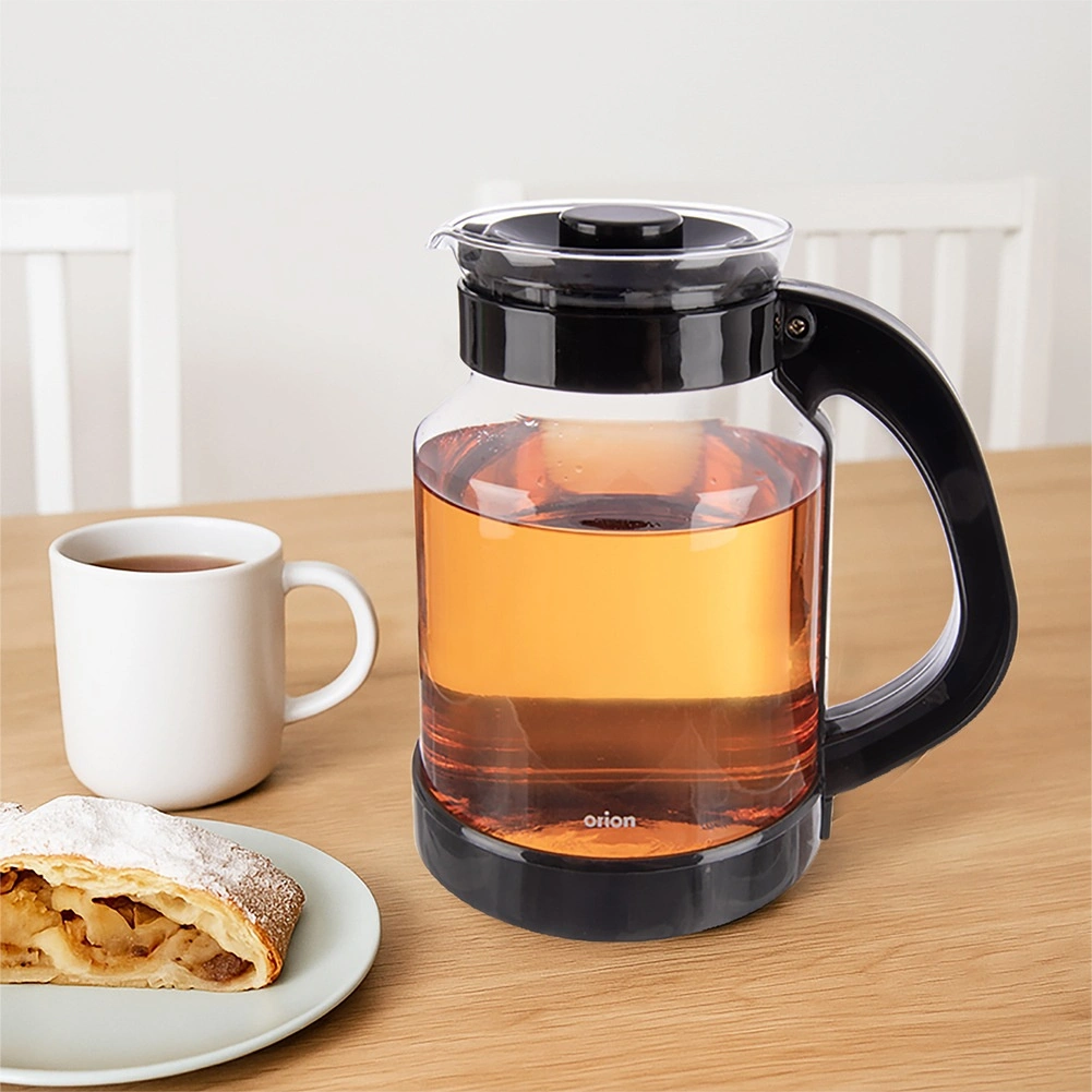 Stakleni vrč ORION zapremnine 2,25 l idealan je za pripremu toplih napitaka kao što su čaj, kava ili biljni napitci, kao i za posluživanje hladnih napitaka, sokova i vode. Prozirno tijelo omogućuje jednostavnu kontrolu količine i jačine napitka, dok poklopac štiti sadržaj od prašine i pomaže zadržati temperaturu.