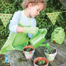 Kantica s čvrstom mlaznicom te gornjom i bočnom ručkom dobro pristaje malim ručicama i omogućuje precizno zalijevanje bez prolijevanja. Elastični rubovi na zapešću rukavica sprječavaju ulazak nečistoća i drže rukavice sigurno na mjestu. Set se sastoji od 6 dijelova i savršen je poklon za djecu od 3 godine naviše.