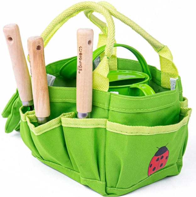 Ovaj zeleni vrtni set za djecu BIGJIGS TOYS potiče učenje kroz igru i ljubav prema prirodi. Platnena torba s motivom bubamara drži svu opremu pregledno pri ruci, dok kvalitetne drvene drške i metalni nastavci alata osiguravaju sigurno i izdržljivo korištenje. Idealan za prvo sijanje, presađivanje i zalijevanje s roditeljima.