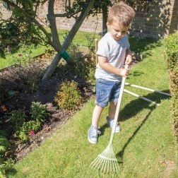 Ergonomska drvena drška i uravnotežena konstrukcija omogućuju djeci udobnu i sigurnu uporabu pri grabljenju lišća i trave.