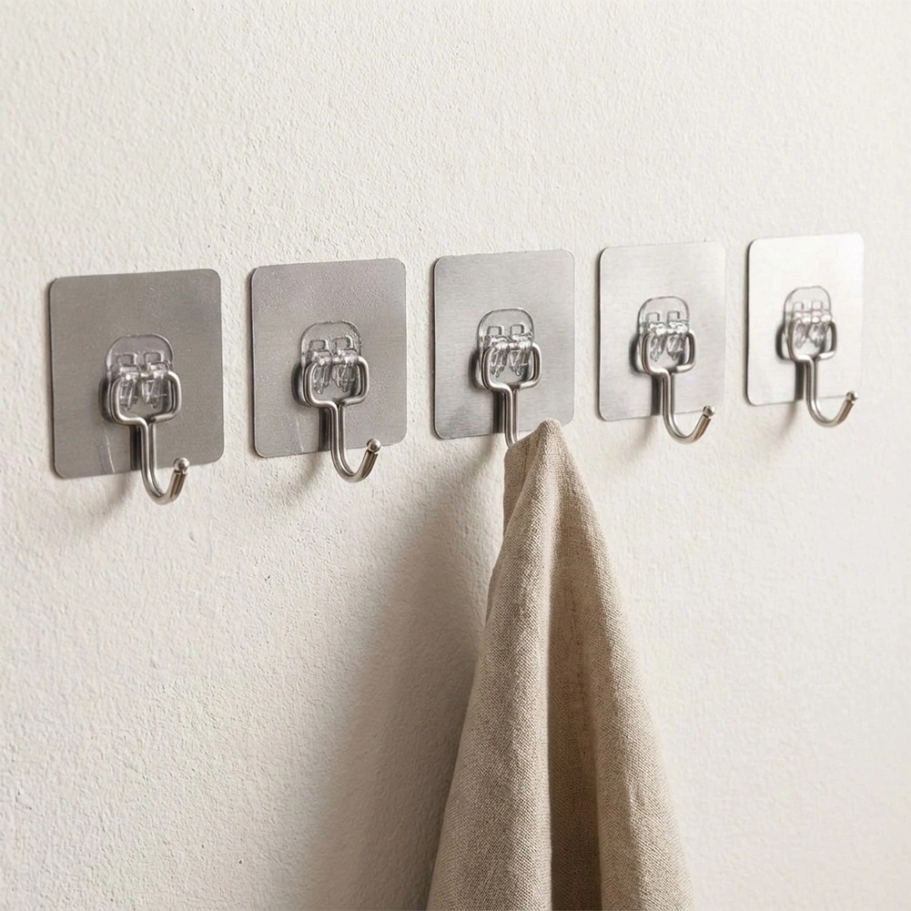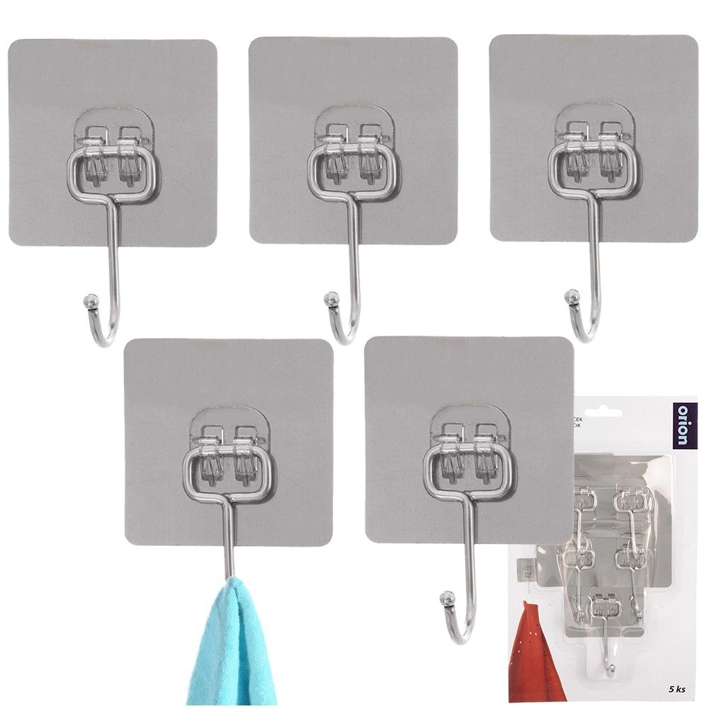 Praktičan set od pet samoljepljivih kuka za svako kućanstvo. Zahvaljujući jakoj adheziji čvrsto drže na glatkim površinama bez potrebe za bušenjem. Izrađene od izdržljivog nehrđajućeg čelika, idealne za kuhinju i kupaonicu za ručnike, krpe, kućne ogrtače ili ključeve. Jednostavna instalacija – odmastiti, pritisnuti i gotovo.