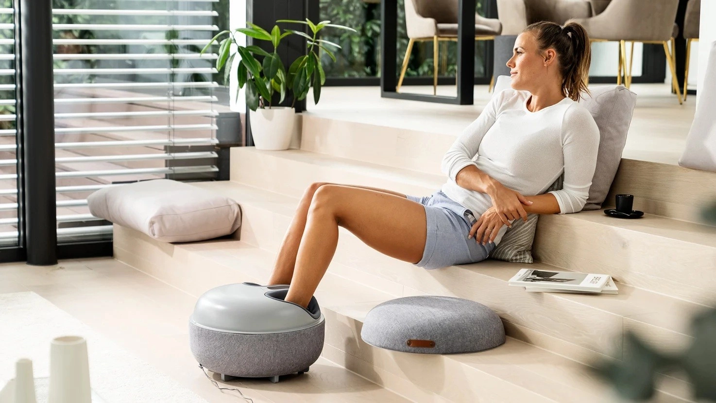 Nakon stavljanja poklopca masažer se pretvara u elegantan oslonac za noge. Kvalitetna tkanina i kompaktan oblik uređaja izvrsno se uklapaju u svaki moderan interijer.