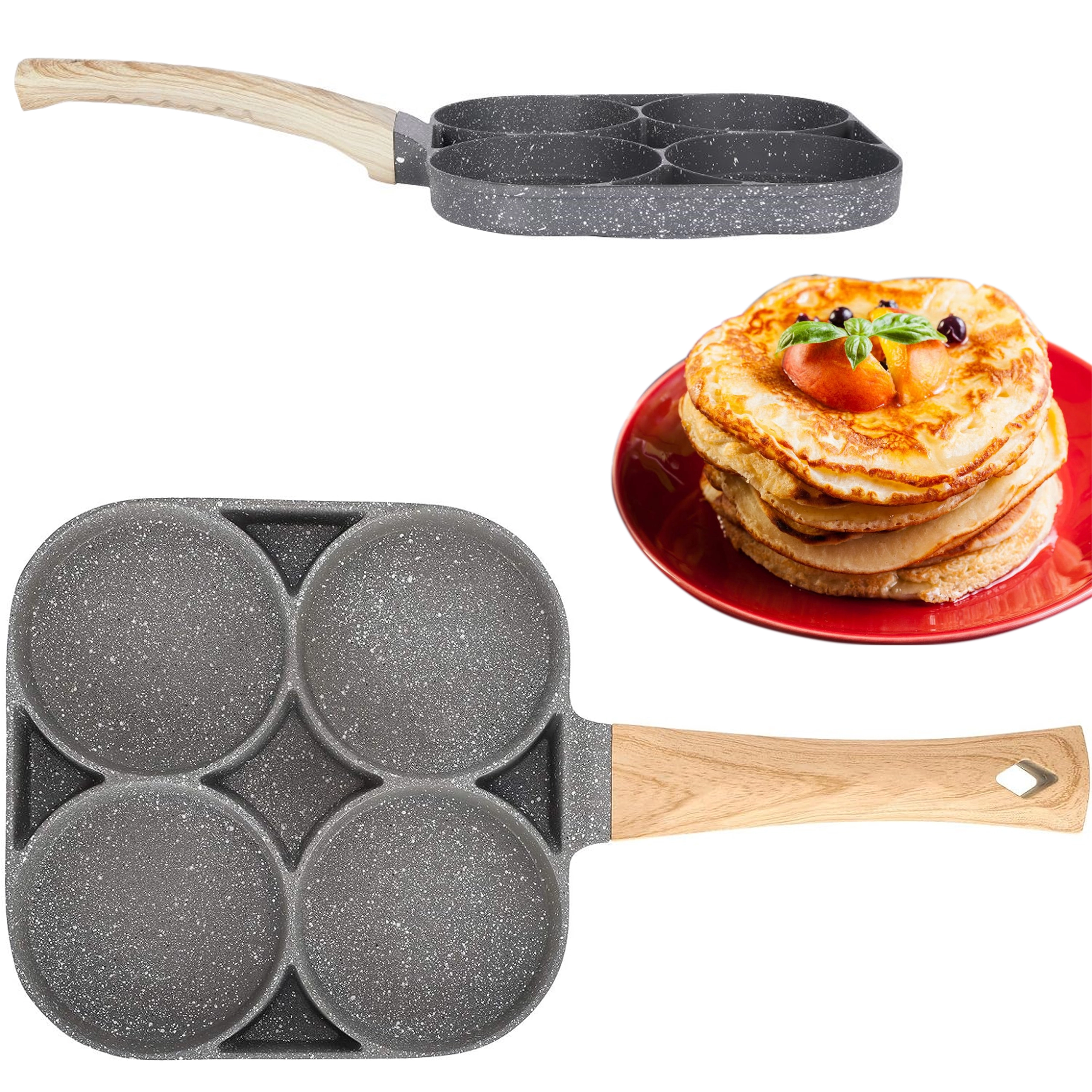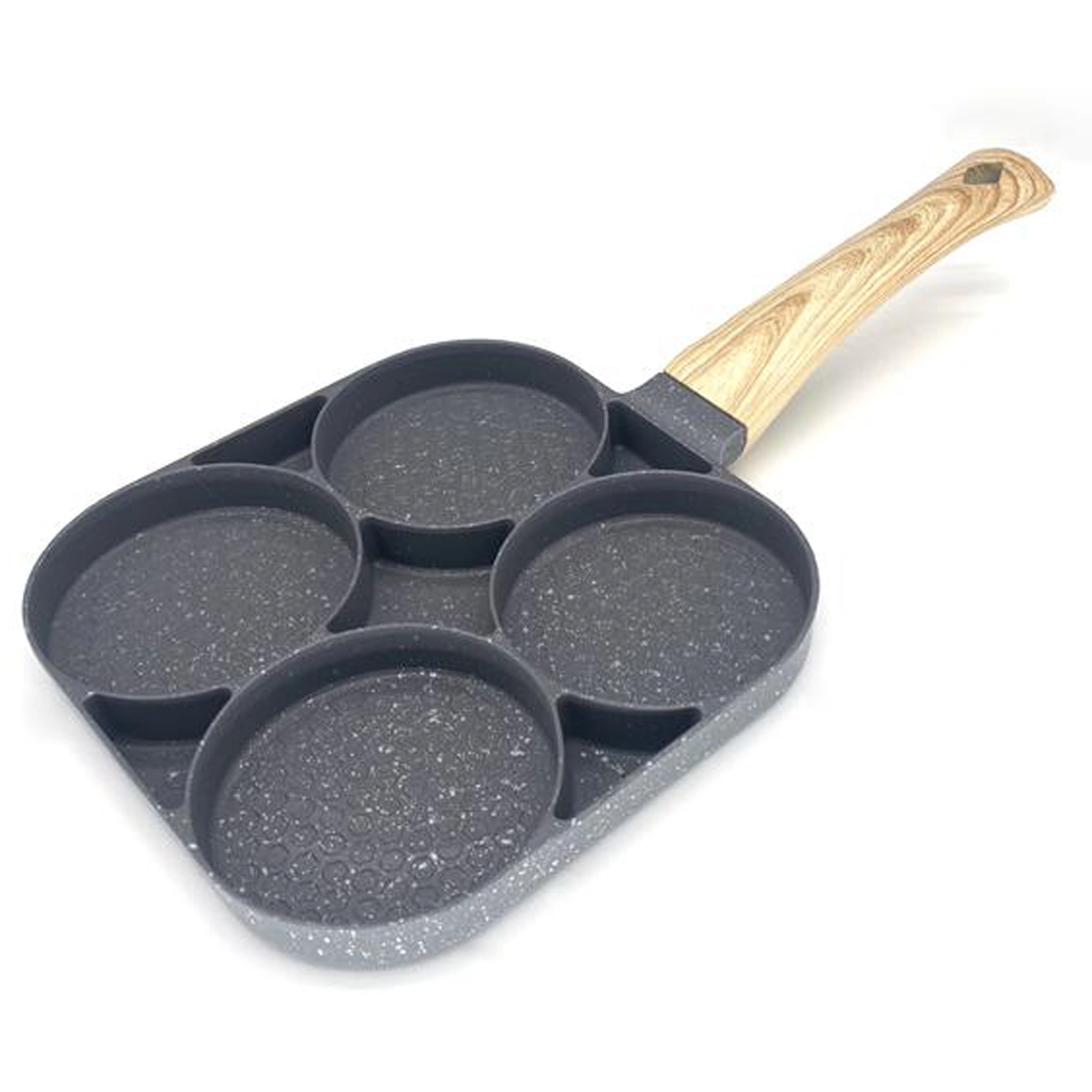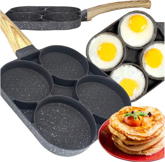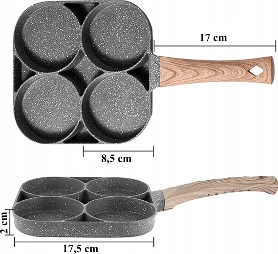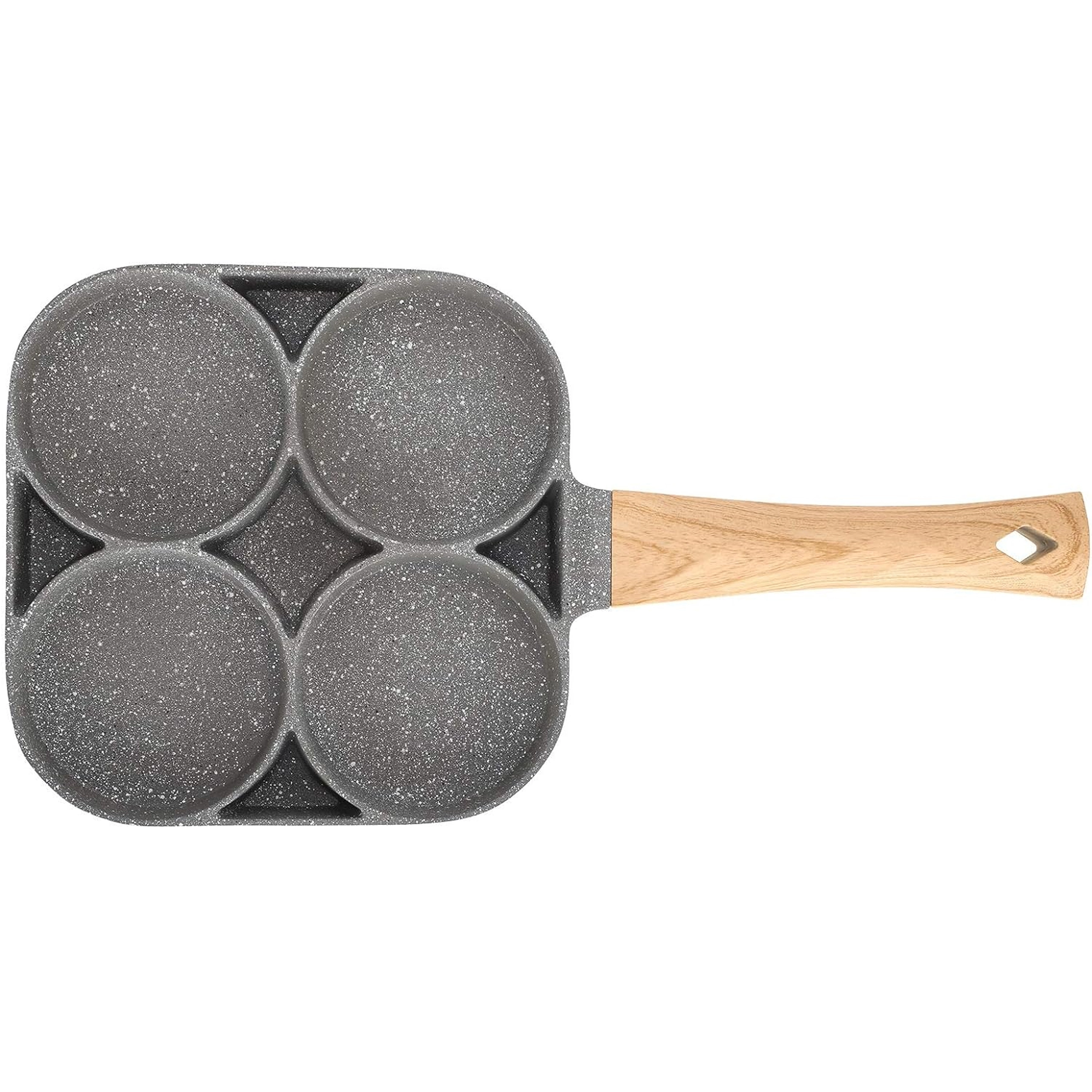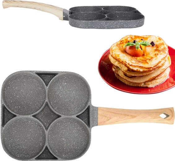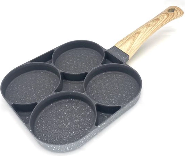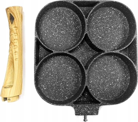 Pripremite doručak brže i bez nereda s ovom univerzalnom tavom s četiri okrugle komore. Zahvaljujući neljepljivoj površini i ravnomjernoj raspodjeli topline pripremit ćete jaja, palačinke, lepinjice i mini palačinke savršenog oblika, i to istovremeno. Ergonomska drška s drvenim izgledom ugodno leži u ruci, a tava je prikladna za indukciju, plin i druge vrste štednjaka.