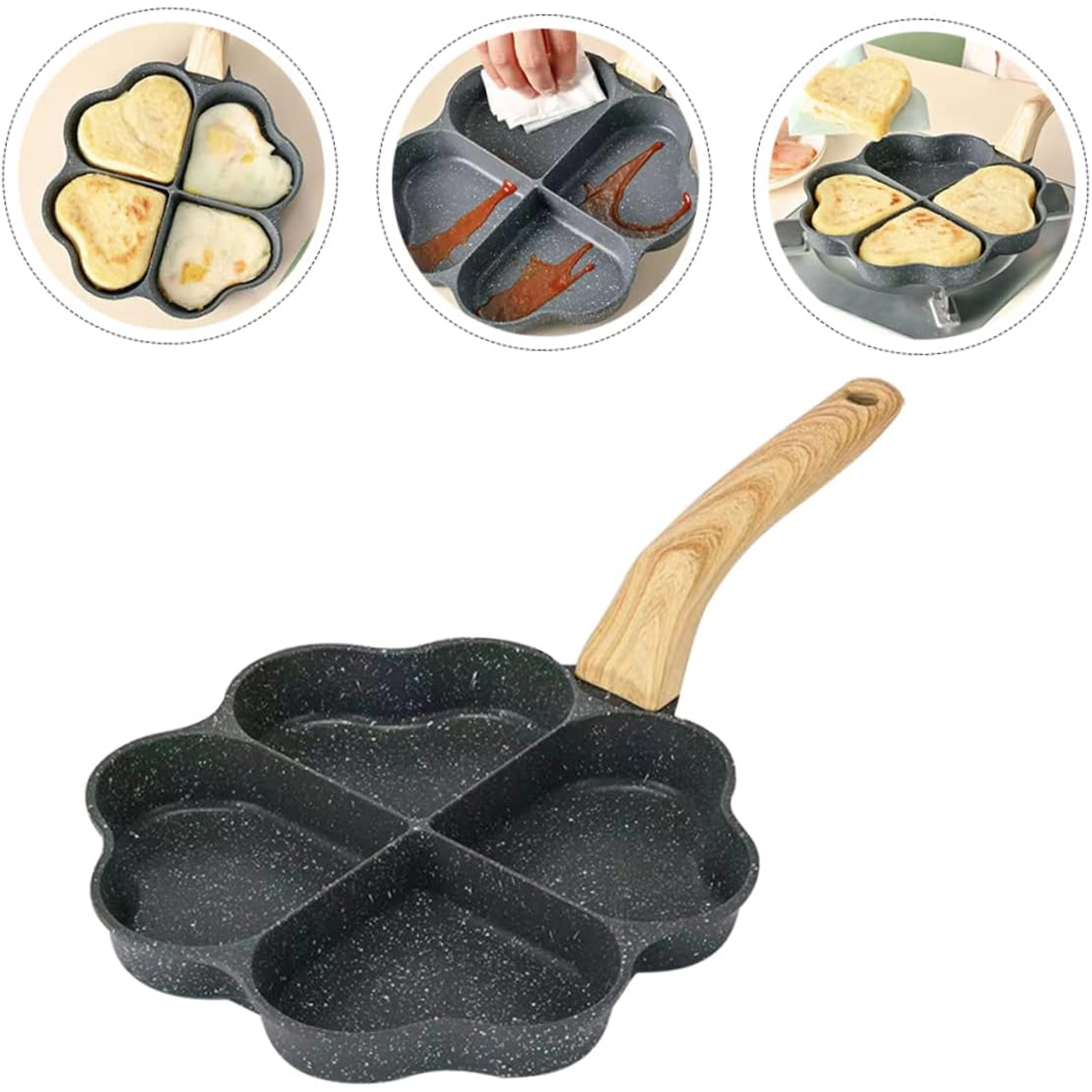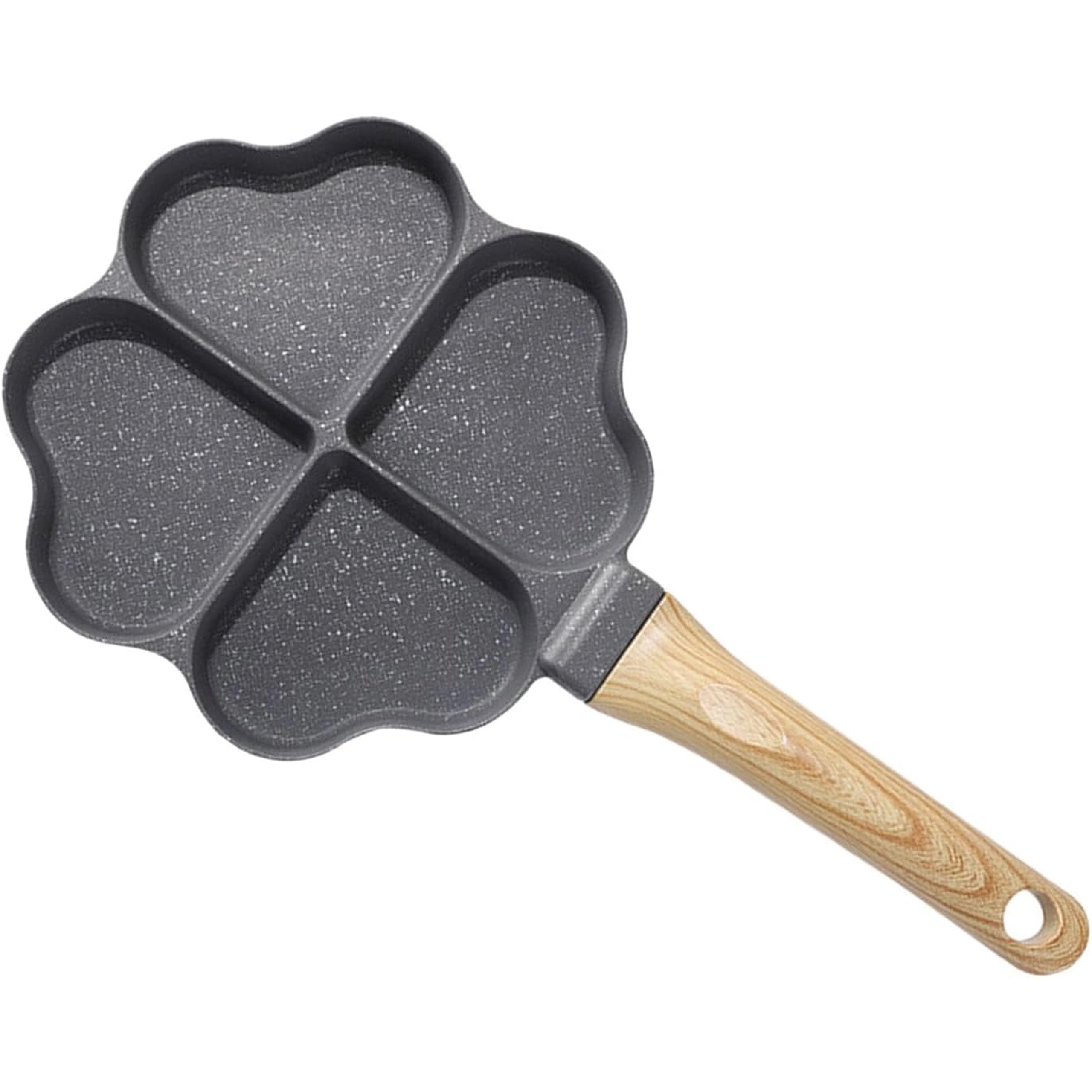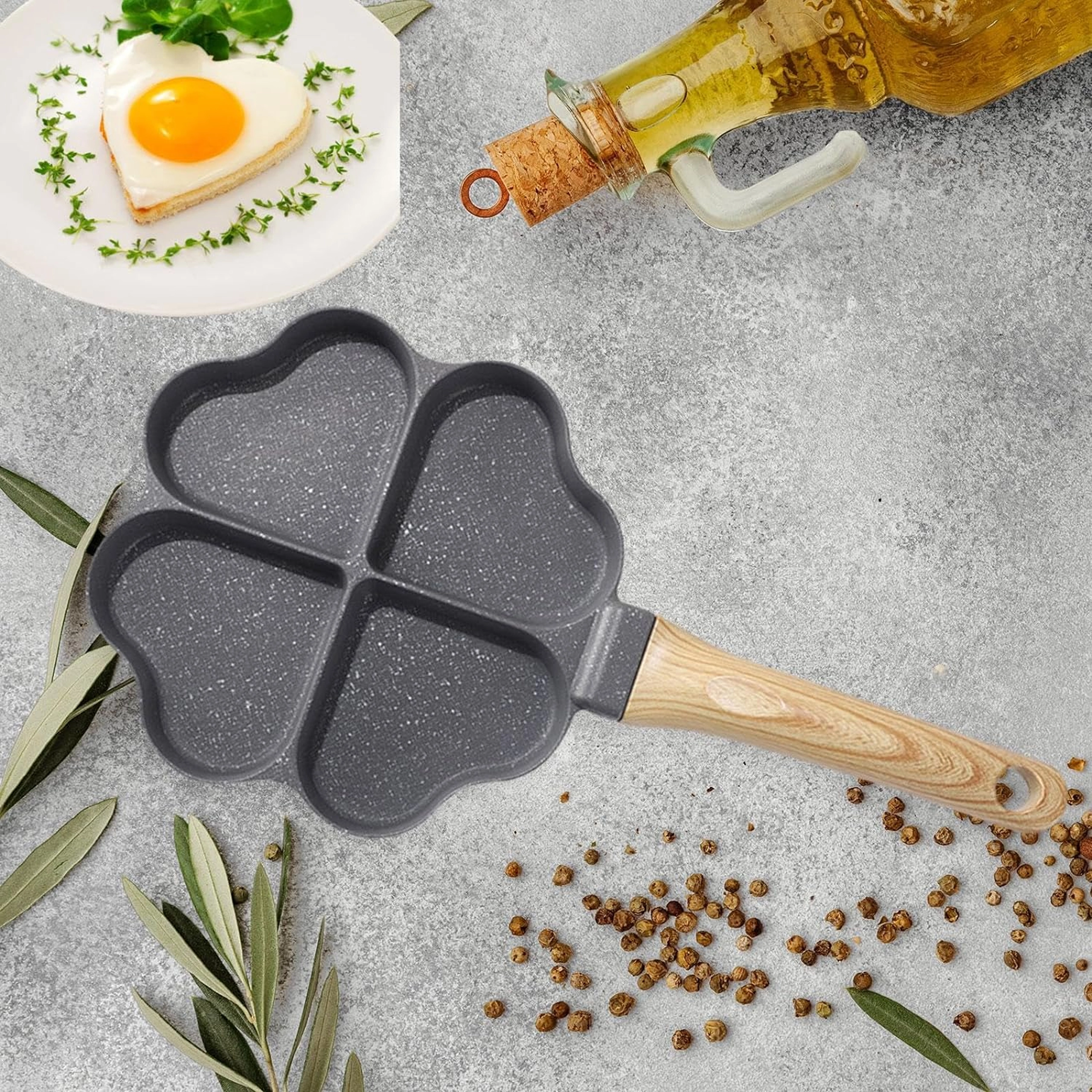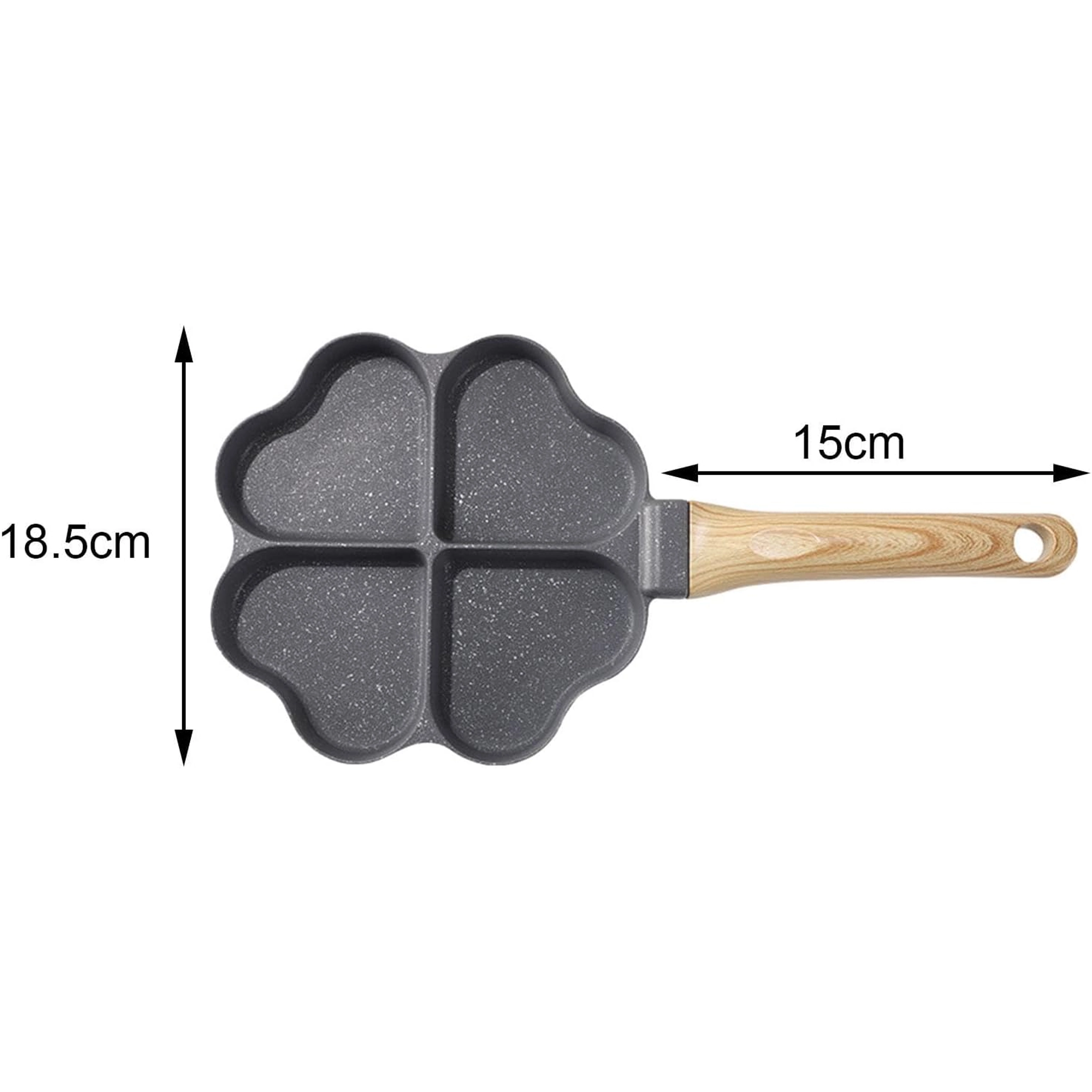 Ova četverodijelna tava sa srcolikim pretincima idealna je za pripremu ravnomjernih porcija – palačinki, jaja, popečaka od krumpira ili mini placki. Neljepljiva, lako periva površina osigurava čisto okretanje i jednostavno čišćenje, dok odvojeni odjeljci održavaju svaku porciju lijepo oblikovanom.
