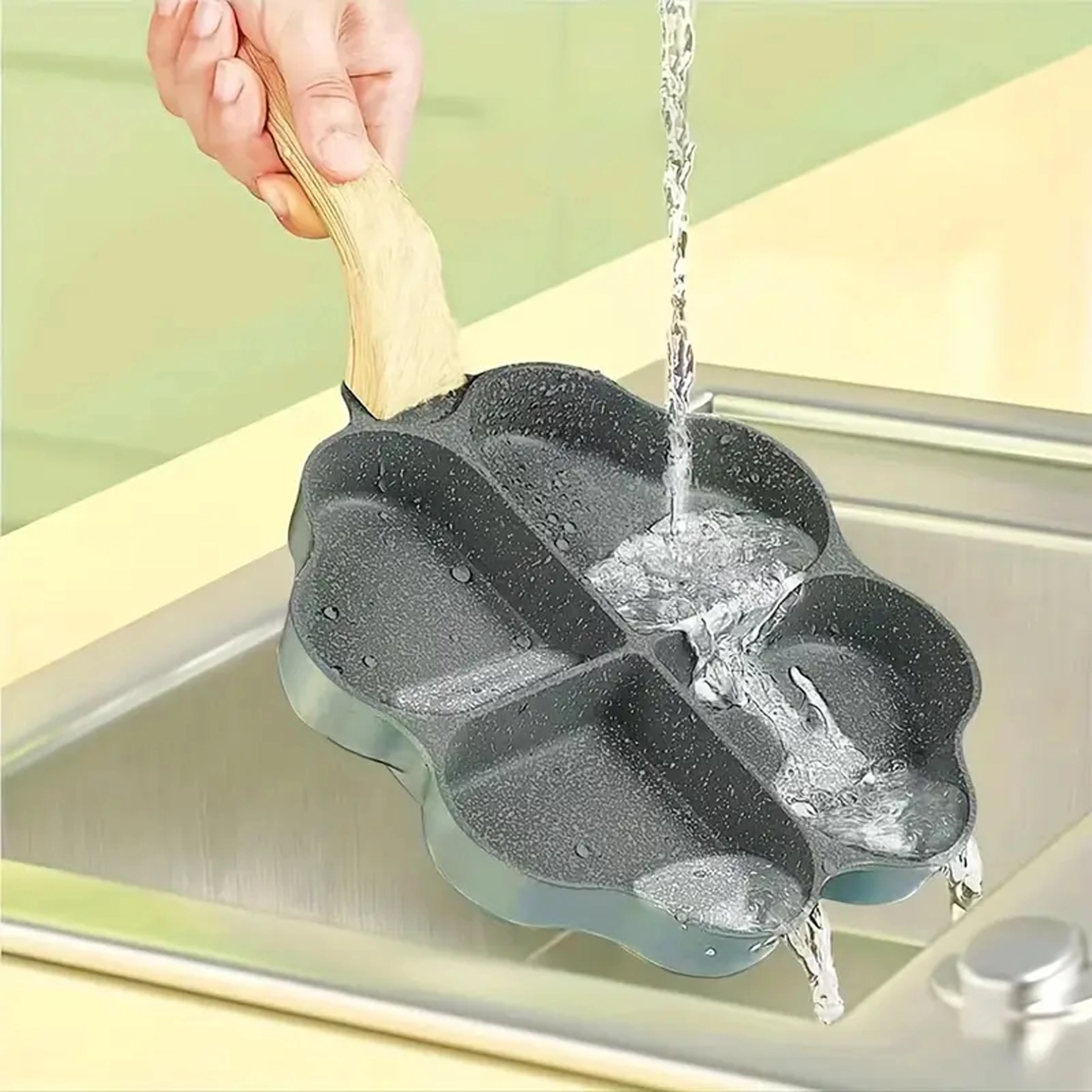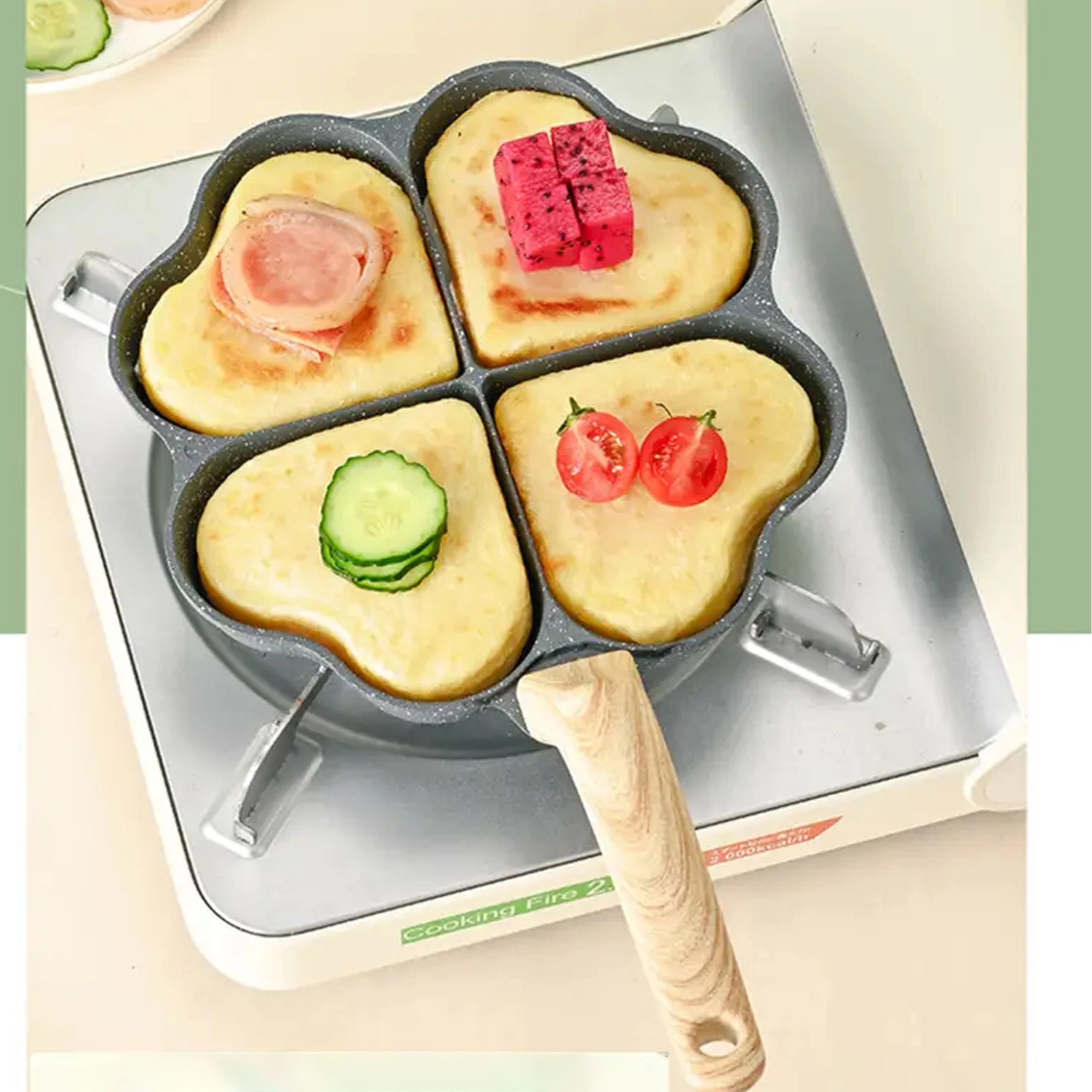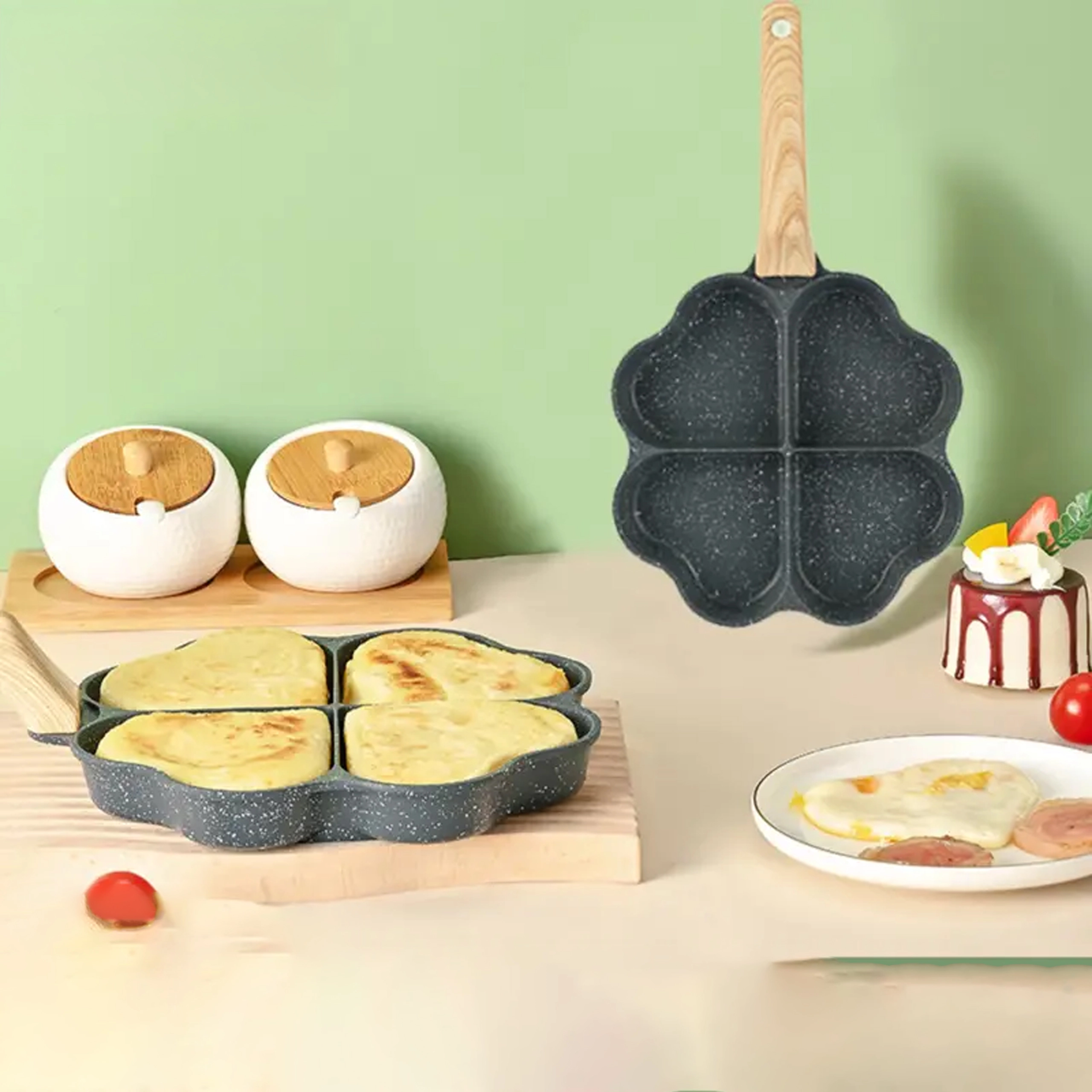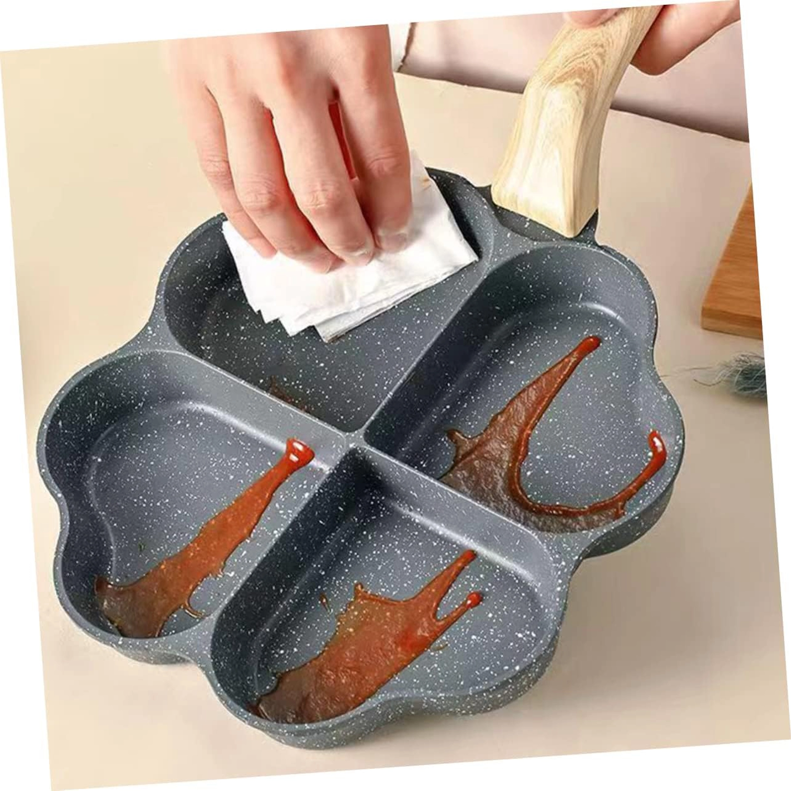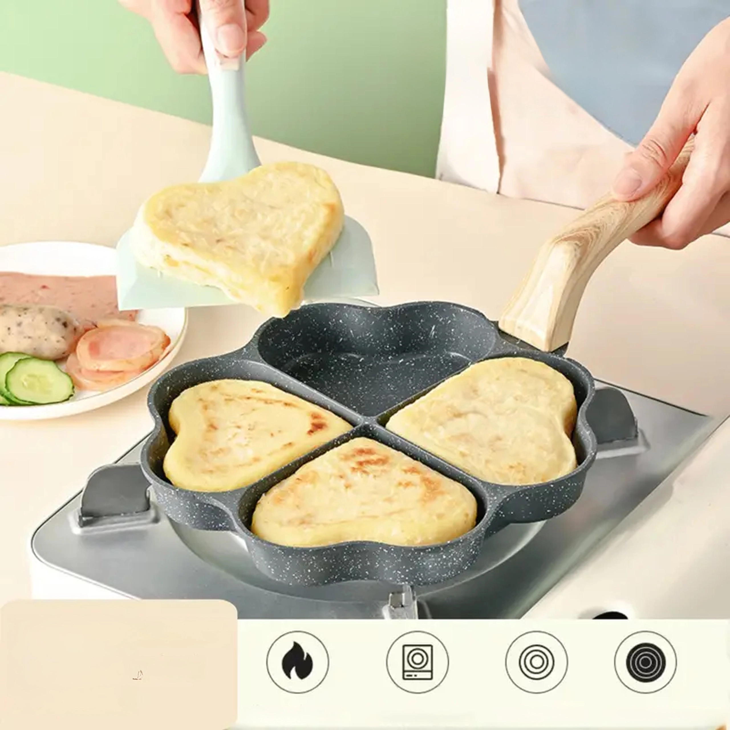 Ova četverodijelna tava sa srcolikim pretincima idealna je za pripremu ravnomjernih porcija – palačinki, jaja, popečaka od krumpira ili mini placki. Neljepljiva, lako periva površina osigurava čisto okretanje i jednostavno čišćenje, dok odvojeni odjeljci održavaju svaku porciju lijepo oblikovanom.