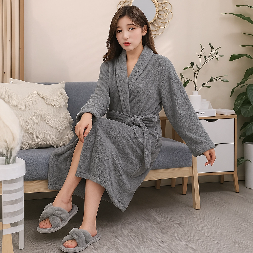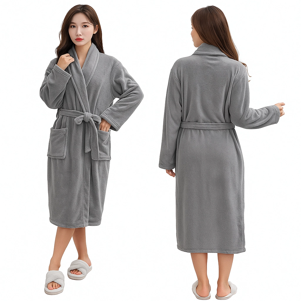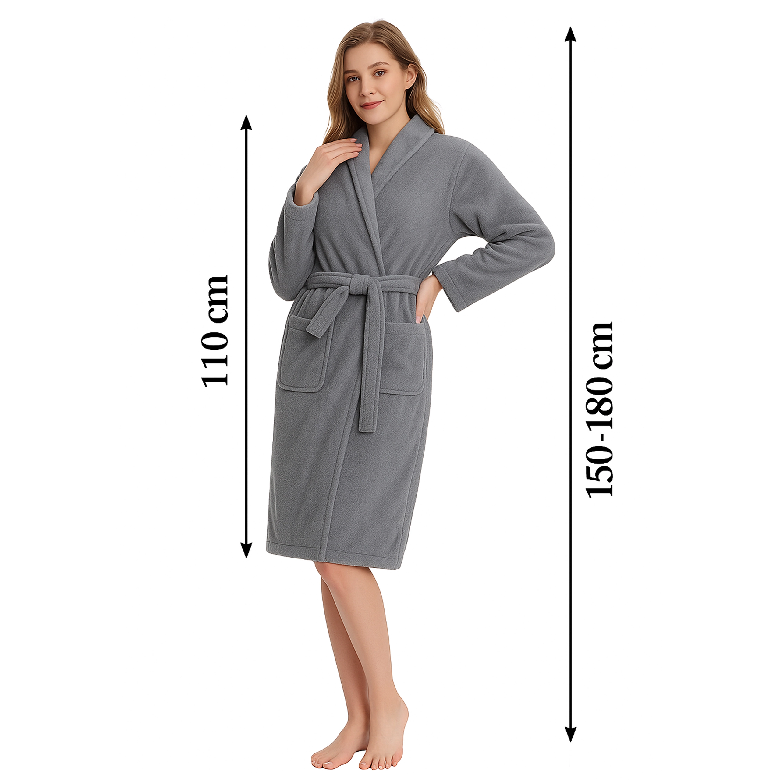 Ovaj ženski ogrtač u elegantnoj sivoj boji idealan je za trenutke opuštanja kod kuće i nakon tuširanja. Mekano plišano mikrovlakno ugodno grije, dok šal okovratnik i remen u struku naglašavaju udoban kroj i lako prilagođavanje figuri.