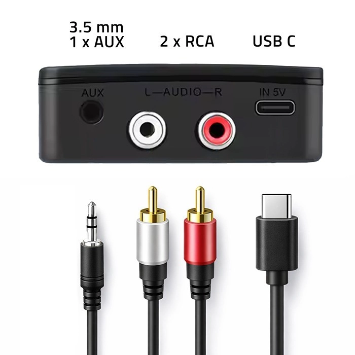 Široka kompatibilnost zahvaljujući izlazima 2× RCA i 3,5 mm AUX. Idealno za modernizaciju starijih Hi‑Fi sustava, pojačala i autoradija bez potrebe za zamjenom uređaja. Plug & Play znači da nema instalacije upravljačkih programa – priključite i odmah koristite.