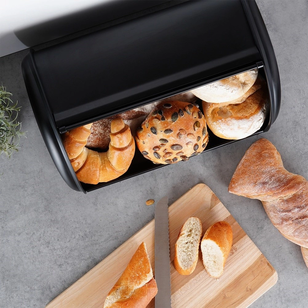 Stilska crna kutija za kruh od izdržljivog nehrđajućeg čelika čuvat će vaše pecivo duže svježim i istovremeno održavati red na radnoj plohi. Zahvaljujući prostoru za različite vrste peciva i praktičnom rolo-poklopcu, svakodnevno rukovanje je brzo i praktično. Moderan dizajn, mat površina i čvrsta metalna konstrukcija savršeno će nadopuniti svaku kuhinju.