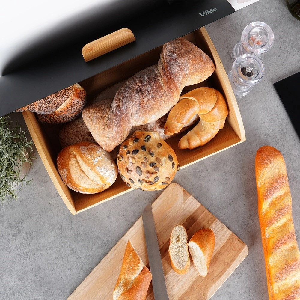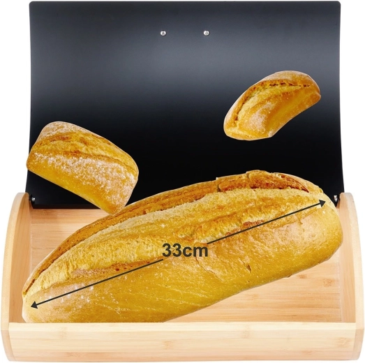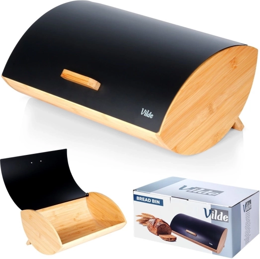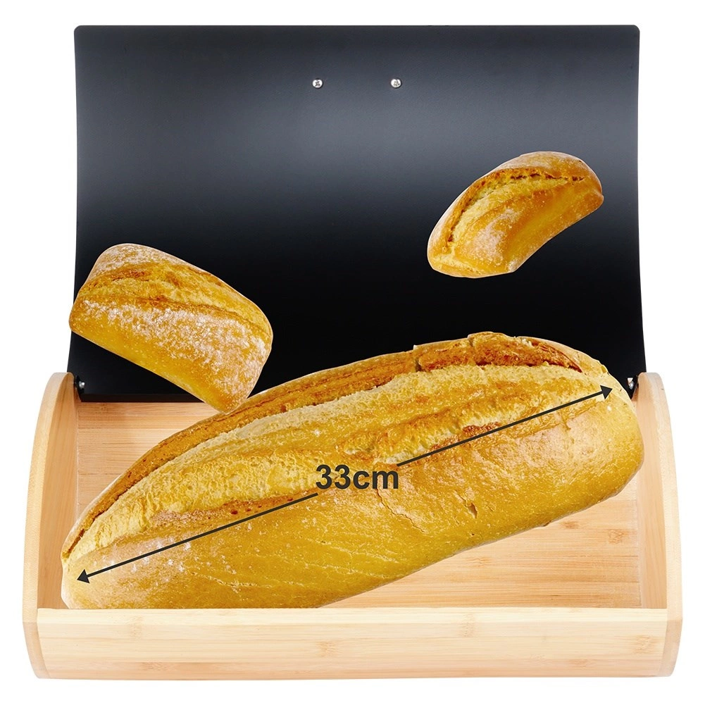 Praktična i stilizirana kutija za kruh dimenzija 35,5 × 24,5 × 15,5 cm idealna je za svakodnevno čuvanje kruha, peciva i slatkih proizvoda. Tijelo od bambusa je lagano i čvrsto, dok poklopac od metala s praškastim premazom u mat crnoj boji djeluje moderno i odolijeva svakodnevnoj upotrebi.
