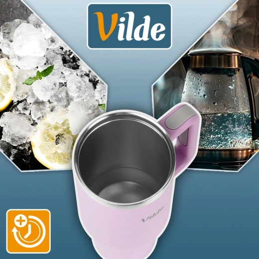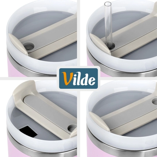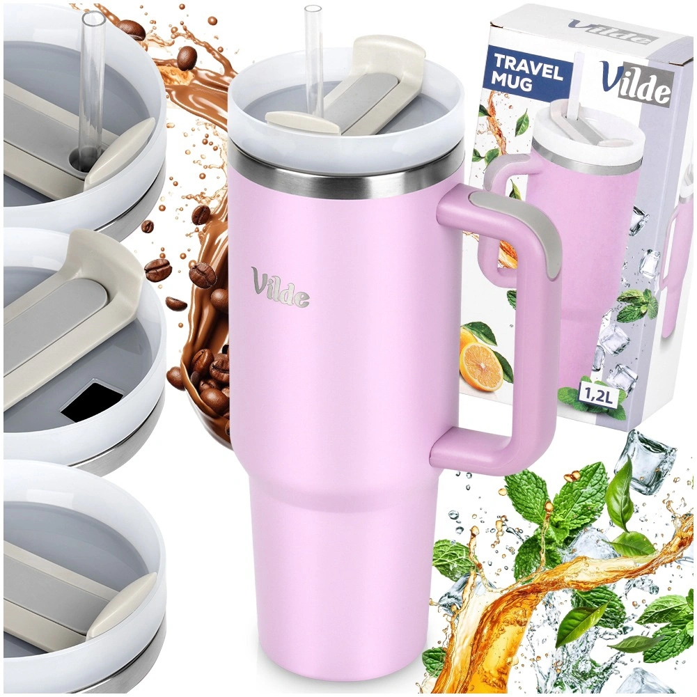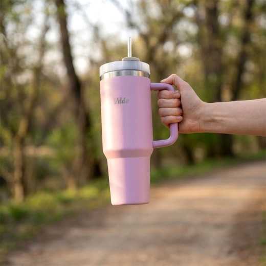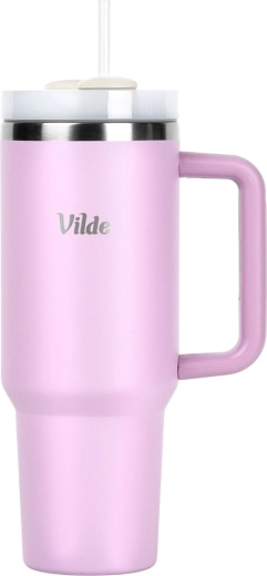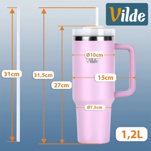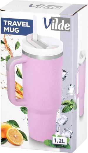 Velikokapacitetna termo šalica 1,2 l s vakuumskom dvostrukom stijenkom održava napitke toplima do 12 sati i hladnima do 8 sati. Ima ergonomsku ručku s protukliznim elementima, poklopac s rotirajućim zatvaračem te mogućnost pijenja kroz slamku ili kroz otvor bez slamke. Tijelo od nehrđajućeg čelika u ružičastoj boji izdržljivo je i sigurno za svakodnevnu uporabu kod kuće, na poslu i na putovanjima.