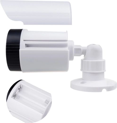 Makete cijevnih kamera dizajnirane su za univerzalnu uporabu u interijeru i na otvorenom. Zahvaljujući izdržljivoj konstrukciji od ABS-a i zaštiti IP44, izgledaju uvjerljivo te podnose uobičajene vanjske uvjete, poput prskajuće vode ili prašine pod nadstrešnicom. Trepćuća crvena LED dioda vjerno imitira rad prave kamere i povećava vidljivu sigurnost objekta.