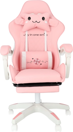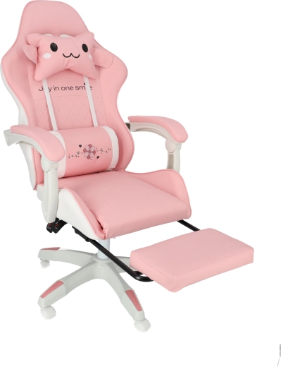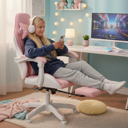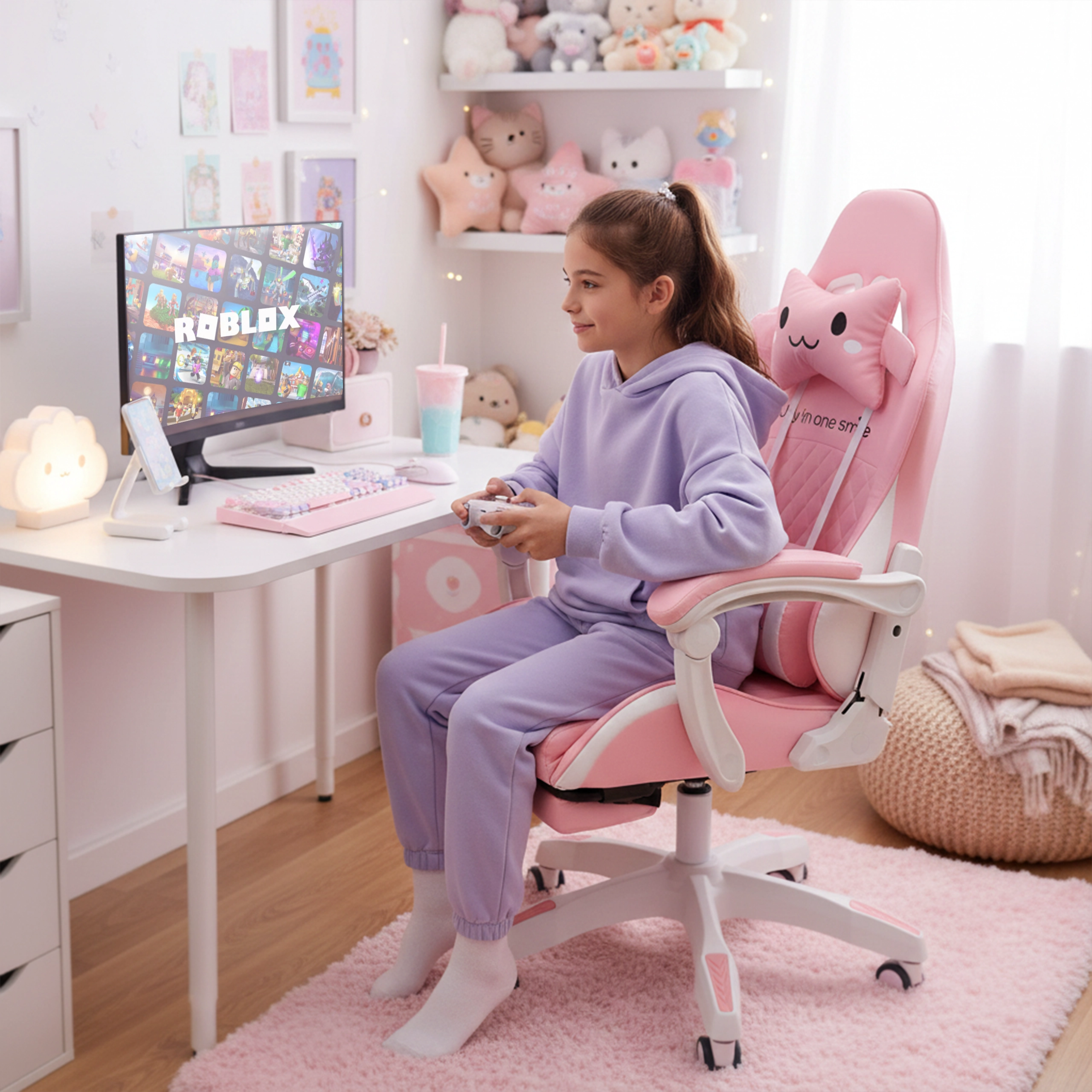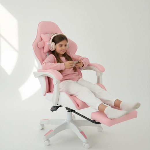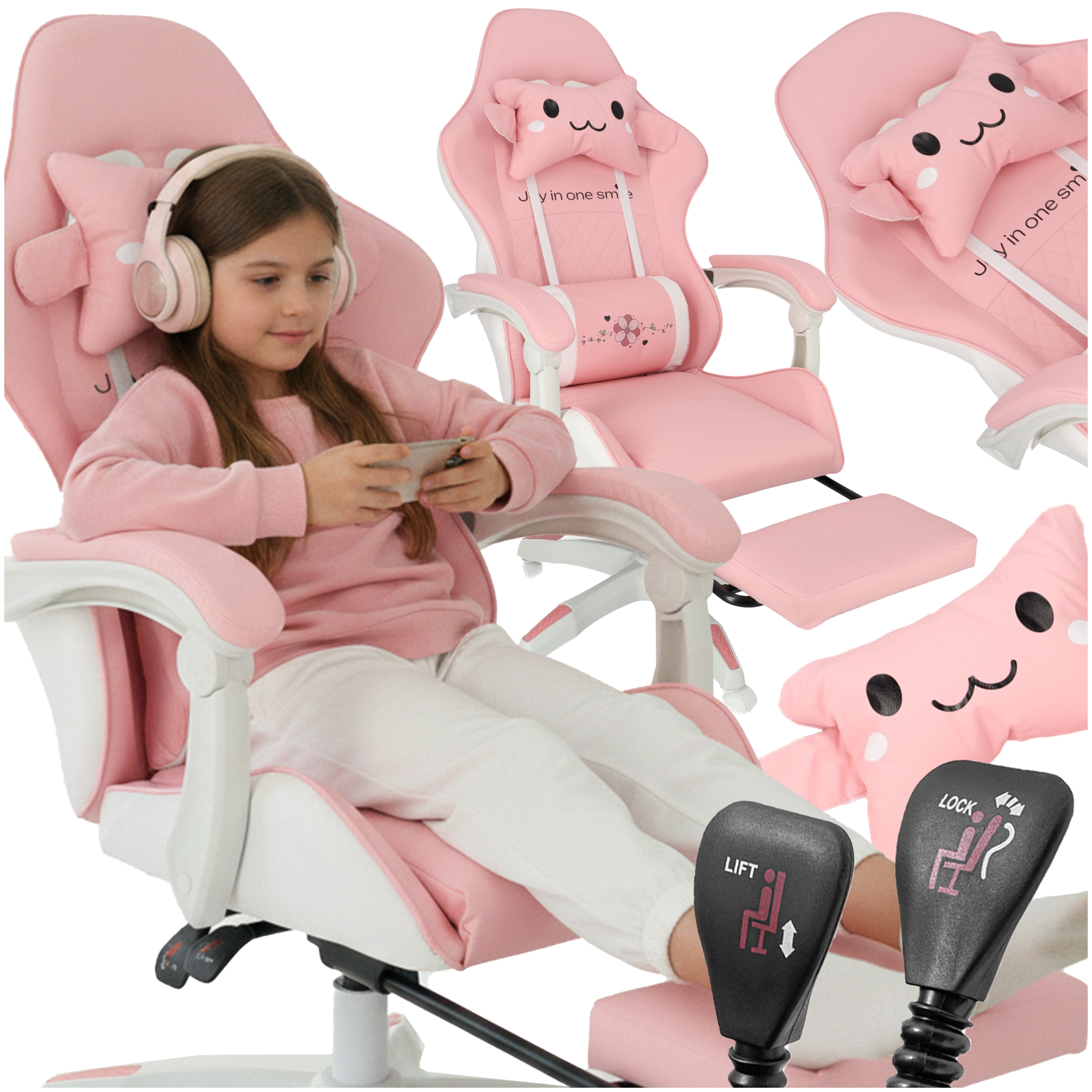 Ružičasta dječja gaming i uredska stolica spaja ergonomski komfor, podesivu visinu i izvlačivi oslonac za noge za brzi odmor. Kacigasto sjedalo sa stabilnom potporom leđa, mekim naslonima za ruke s pjenom i glatkim okretanjem od 360° s kotačićima olakšava učenje i igru. U kompletu su jastučići za vrat i lumbalni dio za zdravije sjedenje u dječjoj sobi.