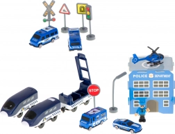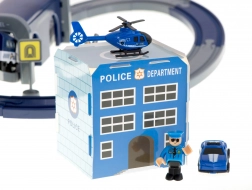 Policijska stanica s heliportom, 4 različita vozila, helikopter, figurica policajca i prometna signalizacija – sve za realistične intervencije i učenje pravila cestovnog prometa.