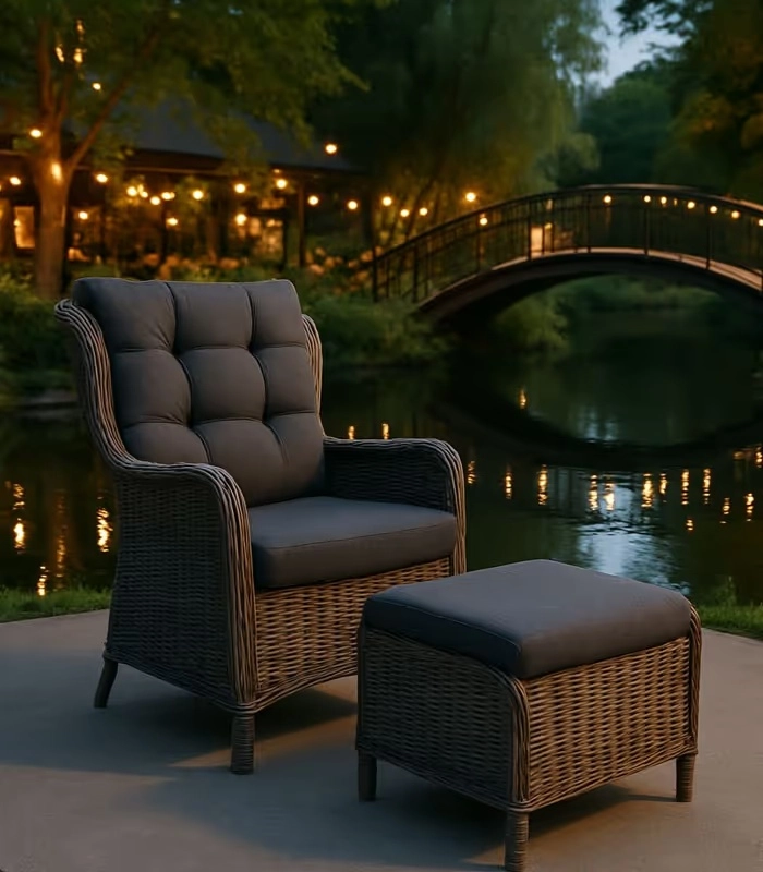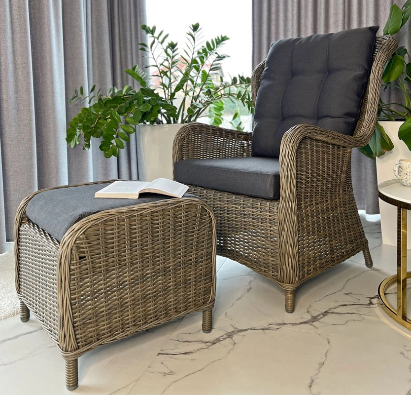 Dizajnerska fotelja SONATA s podnožnikom donosi udobnost, stil i praktičnost u svaki vanjski prostor. Kombinacija poliratana i aluminijskog okvira osigurava malu težinu, čvrstoću i dug vijek bez korozije. Debeli, prošiveni grafitni jastuci brinu za udobno sjedenje i pri duljem opuštanju.