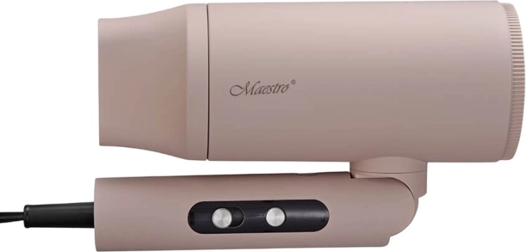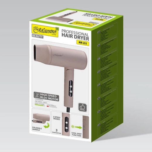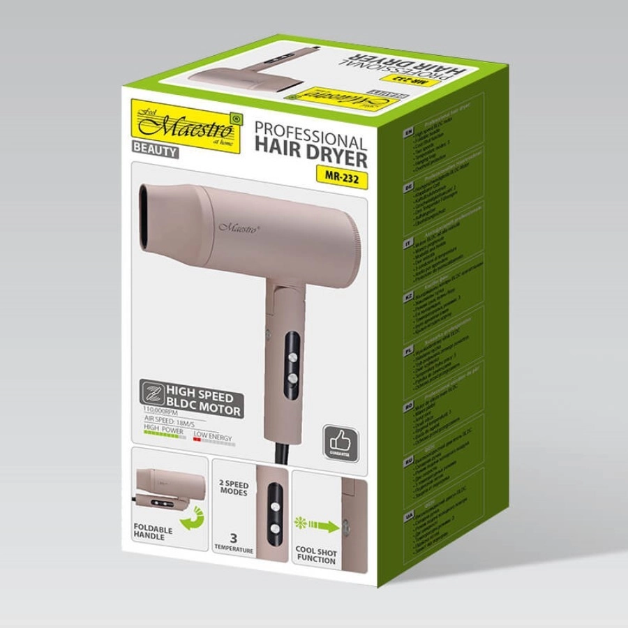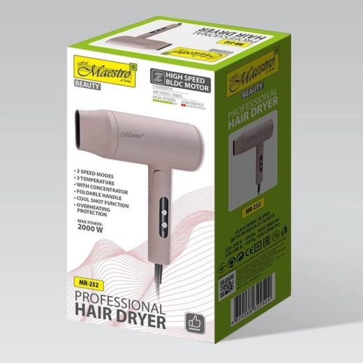 Kompaktno i snažno sušilo za kosu MAESTRO MR-232 nudi snagu od 2000 W, visokookretni BLDC motor s brzinom do 110 000 o/min i protok zraka 18 m/s za brzo sušenje. Na raspolaganju su 2 brzine, 3 razine temperature i funkcija hladnog zraka za fiksiranje frizure. Praktična sklopiva drška, soft touch površina, magnetski koncentrator i kabel duljine 1,75 m osiguravaju udobnost kod kuće i na putu.