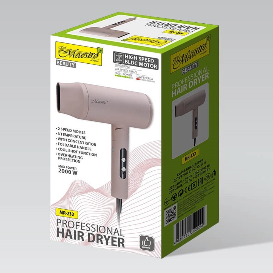 MAESTRO MR-232 idealan je izbor za svakodnevnu njegu i putovanja. Zahvaljujući BLDC motoru dugog vijeka trajanja i snazi od 2000 W kosu suši brzo i nježno, dok protok zraka 18 m/s bez problema savladava gustu i dugu kosu. Precizna podešavanja kroz 2 brzine i 3 razine temperature upotpunjuje hladni zrak za završnu fiksaciju i sjaj.