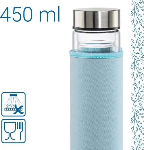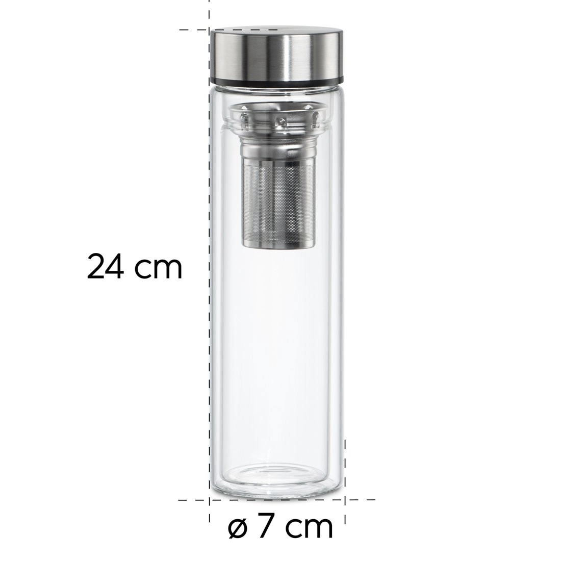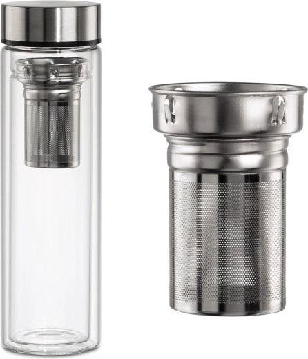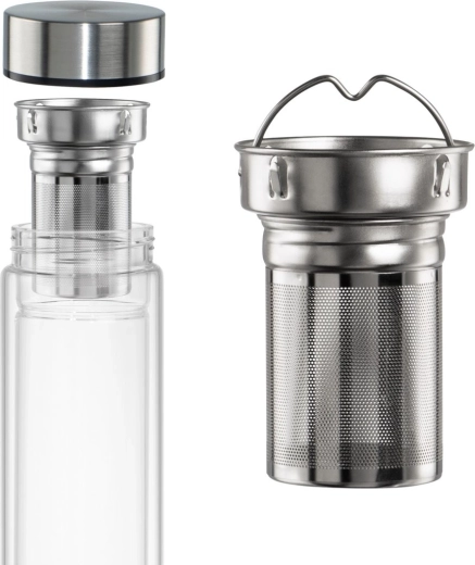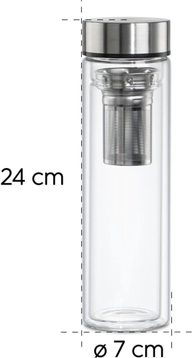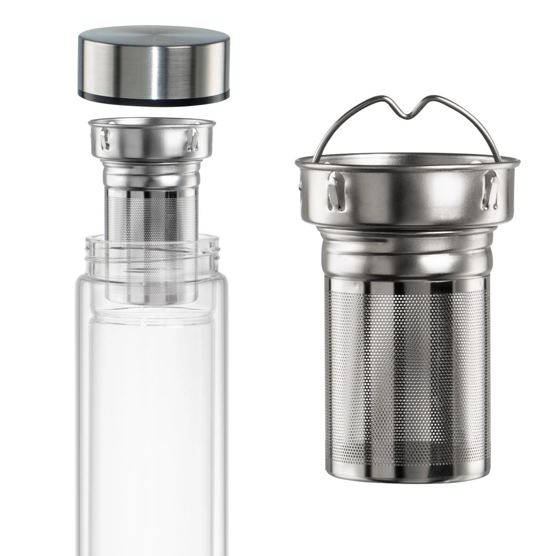 Zahvaljujući kvalitetnom borosilikatnom staklu, boca je lagana, izdržljiva i okusno neutralna. Inox poklopac sa silikonskom brtvom sprječava curenje u torbi ili ruksaku. Izvadivo fino cjedilo s praktičnim držačem olakšava rukovanje i čišćenje.