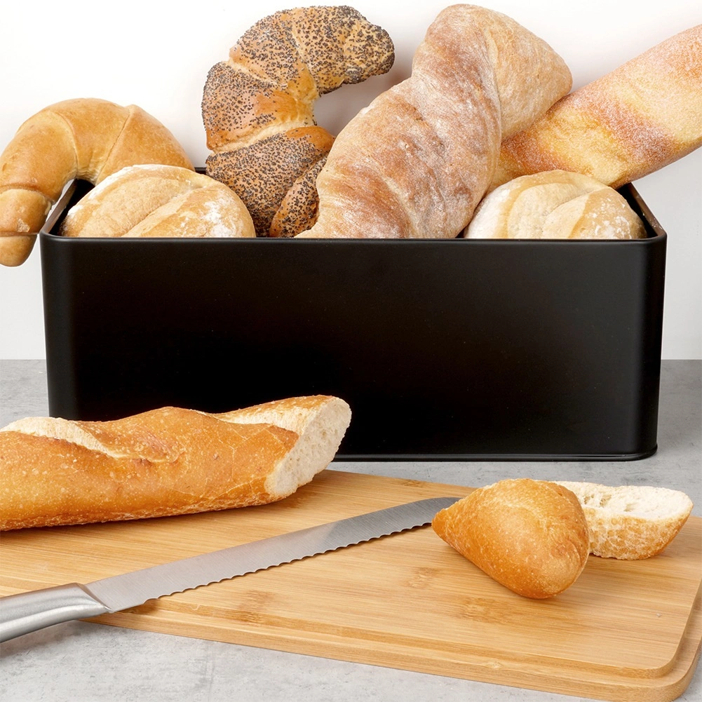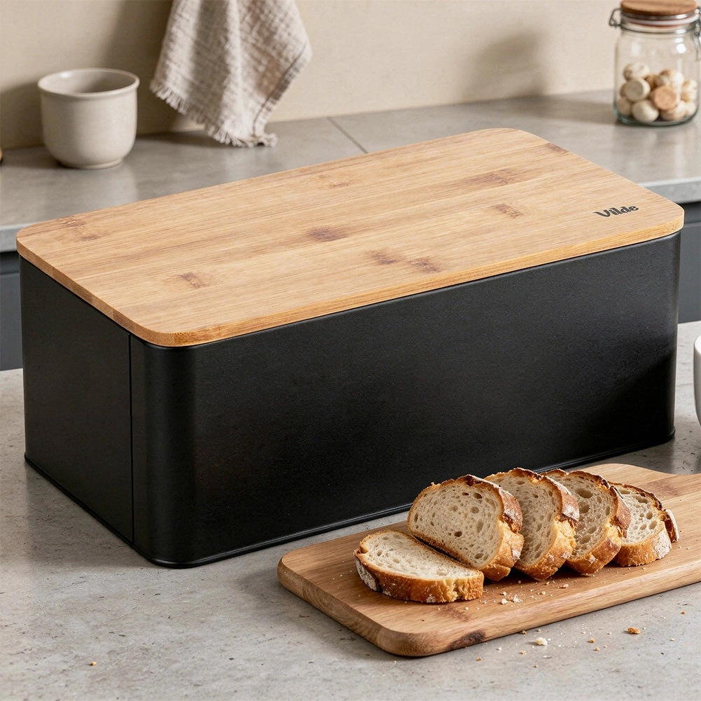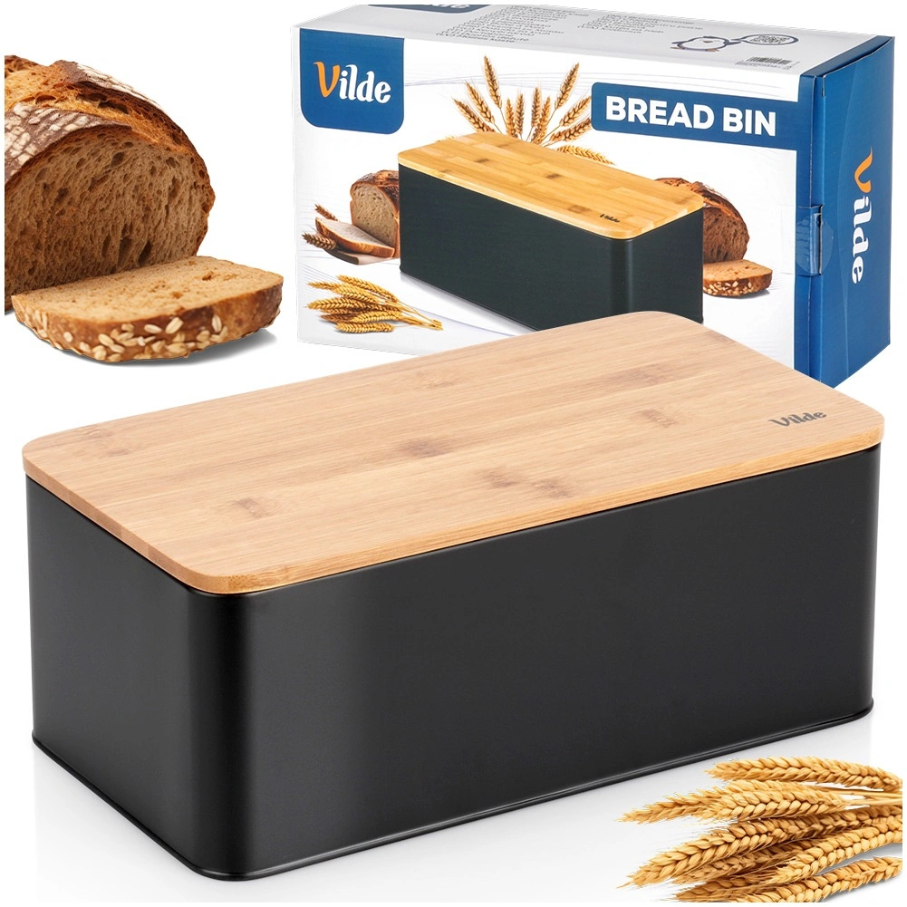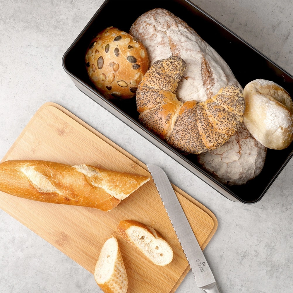 Prostrana kutija za kruh u modernoj crnoj izvedbi kombinira izdržljivo metalno kućište s prirodnim bambusnim poklopcem koji ujedno služi kao daska za rezanje. Dimenzije 33 × 18 × 13 cm nude dovoljno mjesta za kruh, bagete i peciva, dok čvrsta konstrukcija štiti pecivo od gnječenja.