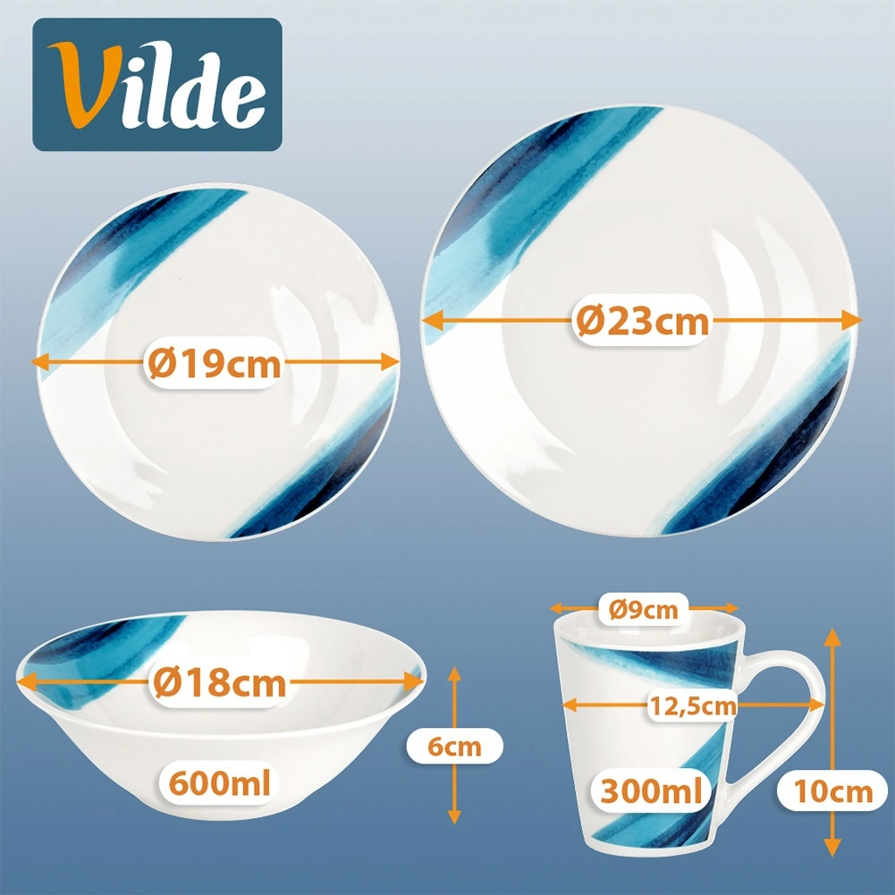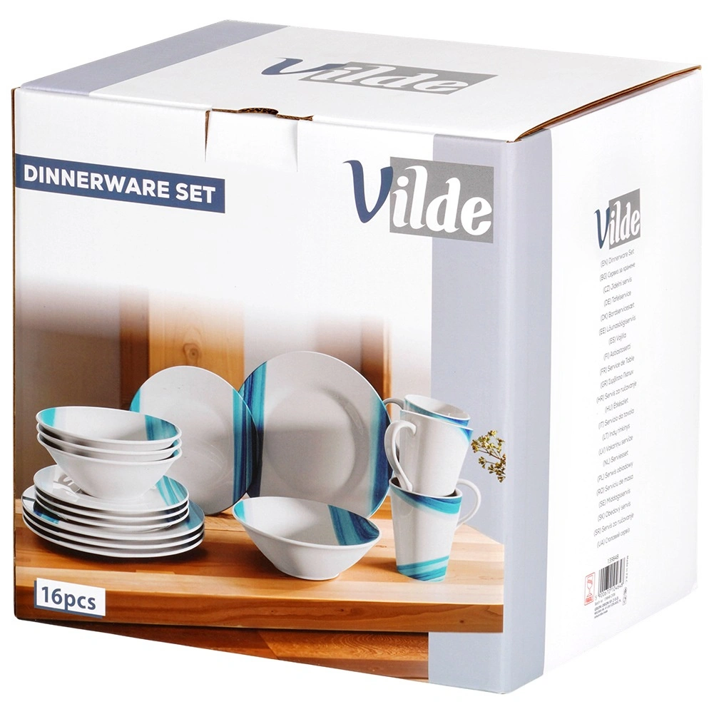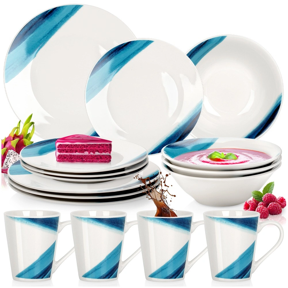 Dobivate 16 dijelova: 4 zdjele (18 × 6 cm, 600 ml), 4 plitka tanjura (23 × 23 × 2 cm), 4 desertna tanjura (19 × 19 × 2 cm) i 4 šalice (12,5 × 9 × 10 cm, 300 ml). Sve usklađeno u jedinstvenom dekoru.