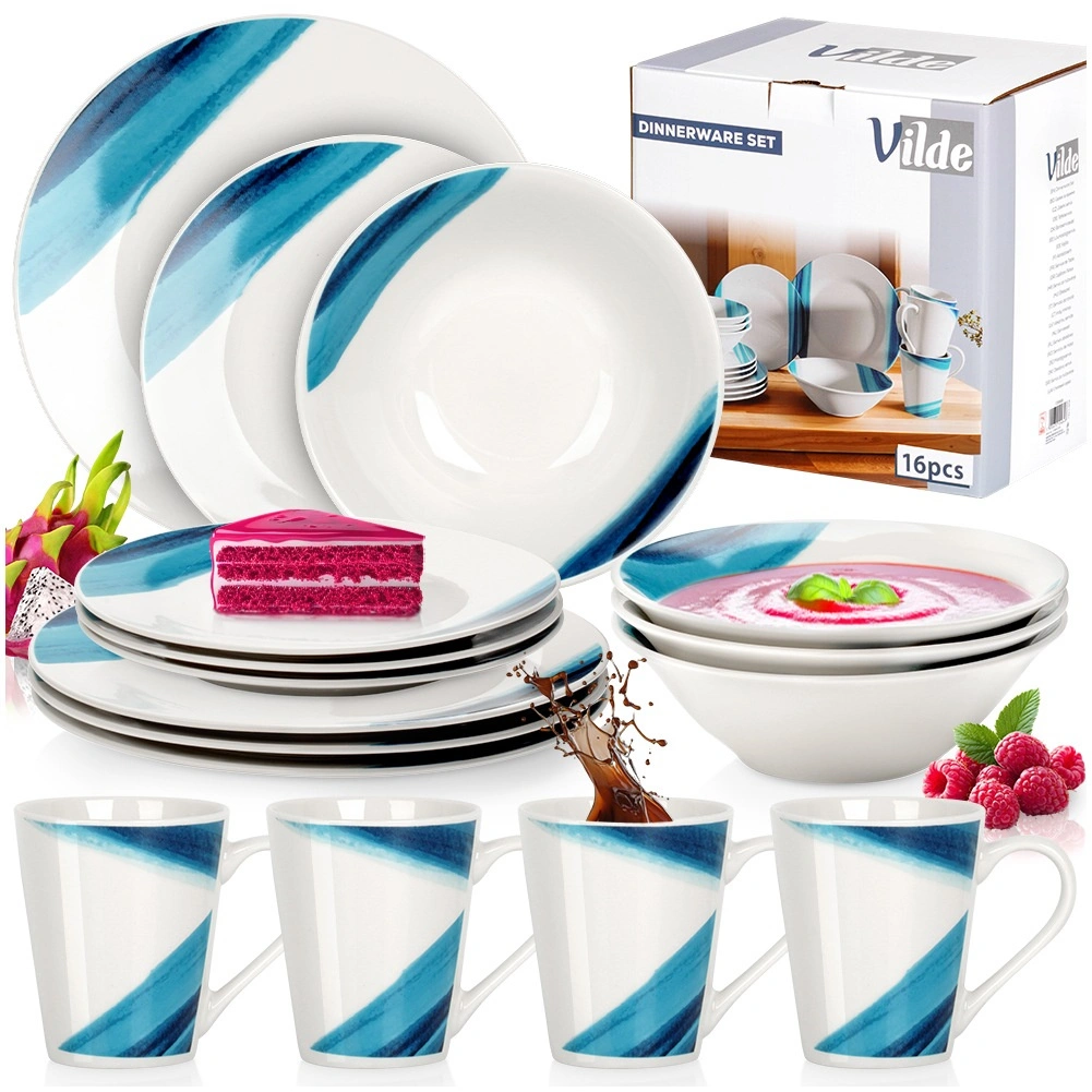 Ovaj 16-dijelni porculanski set donosi uravnoteženu kombinaciju stila, funkcionalnosti i izdržljivosti. Bijela osnova s izraženim plavim dekorom daje svakom postavljenom stolu svjež i moderan izgled. Zahvaljujući univerzalnim veličinama, idealan je za posluživanje juha, glavnih jela, deserata i toplih napitaka.