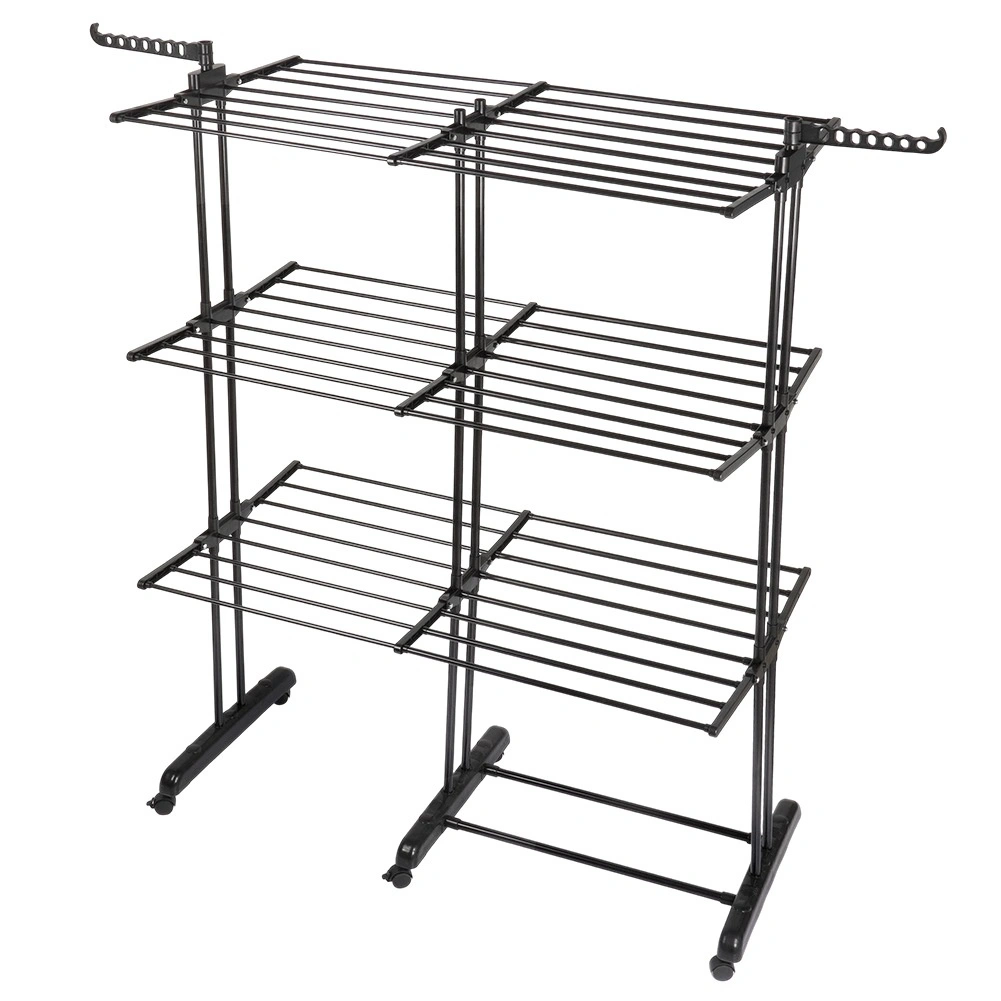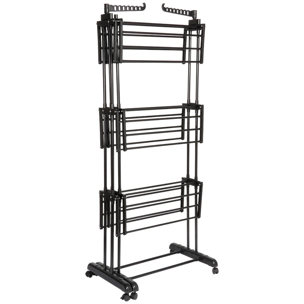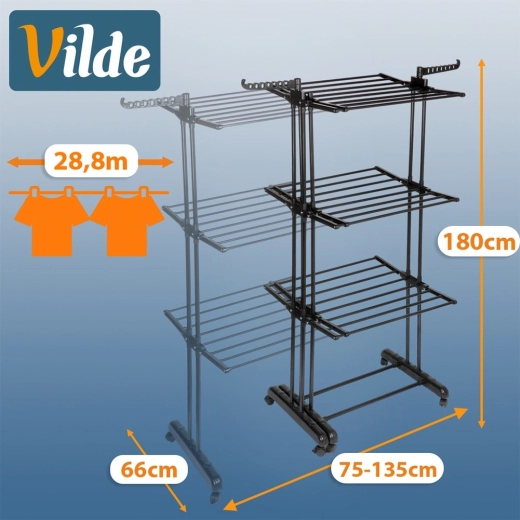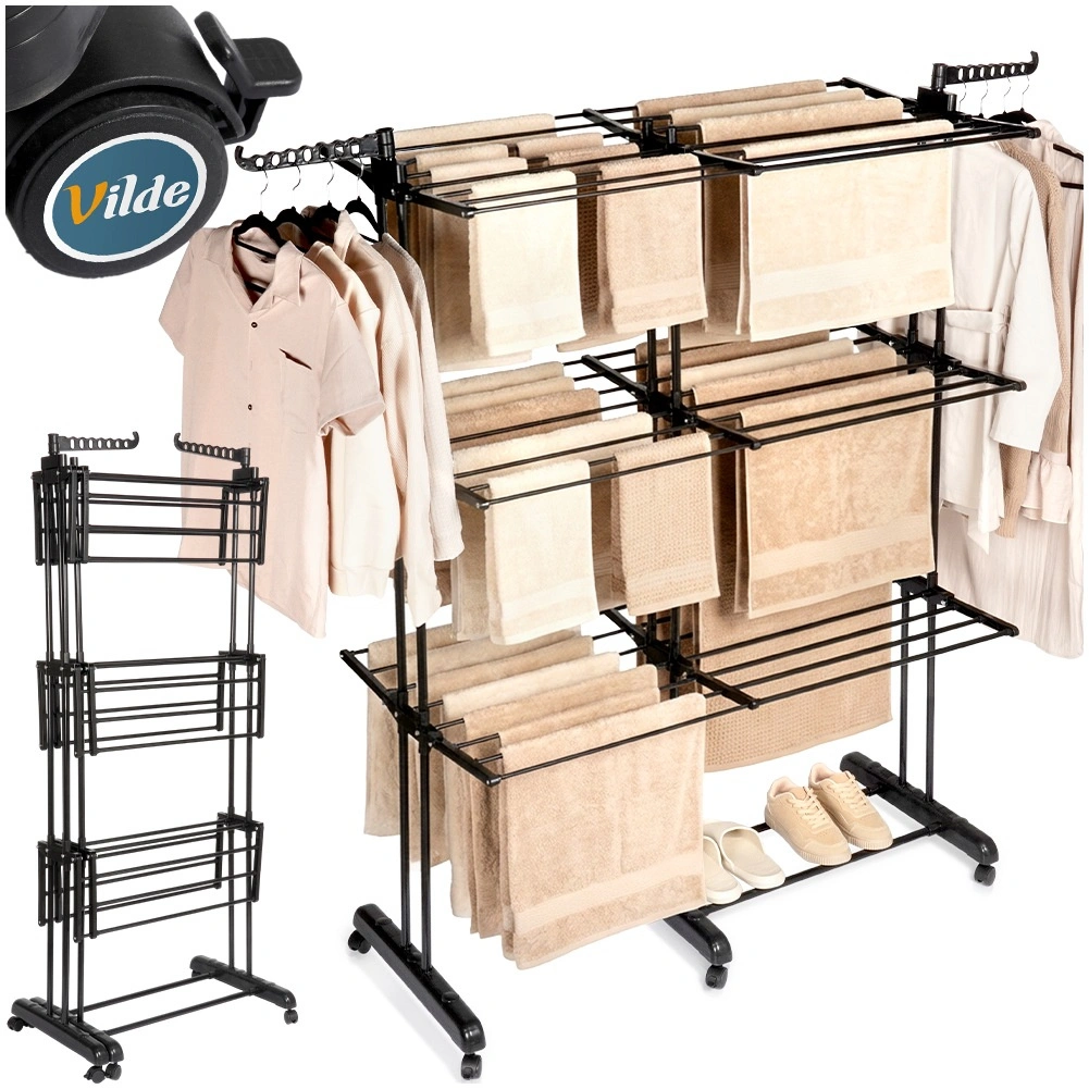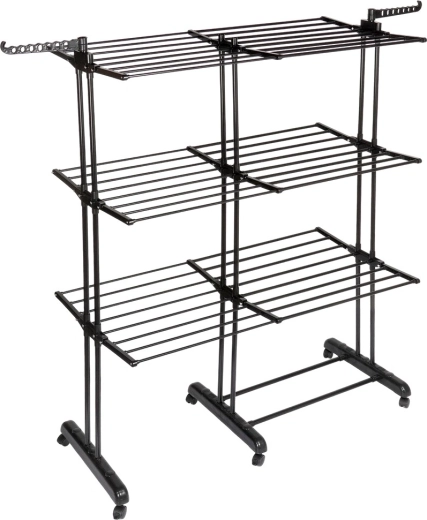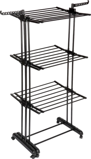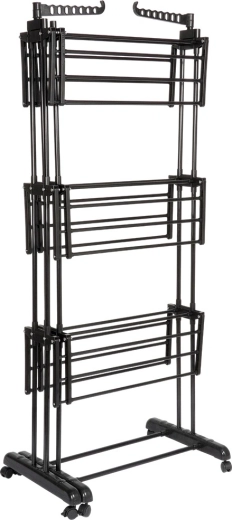 Vertikalno sušilo XXL u elegantnoj crnoj boji idealno je za stan, praonicu i balkon. Tri neovisne razine i šest zasebno sklopivih krila omogućuju prilagodbu prostoru, duljini i količini rublja. Sa strane se nalaze ruke s otvorima za vješalice, a dolje praktična polica, primjerice za obuću.