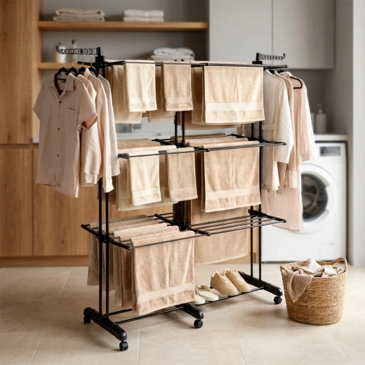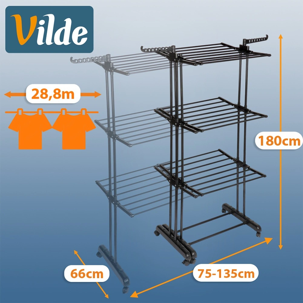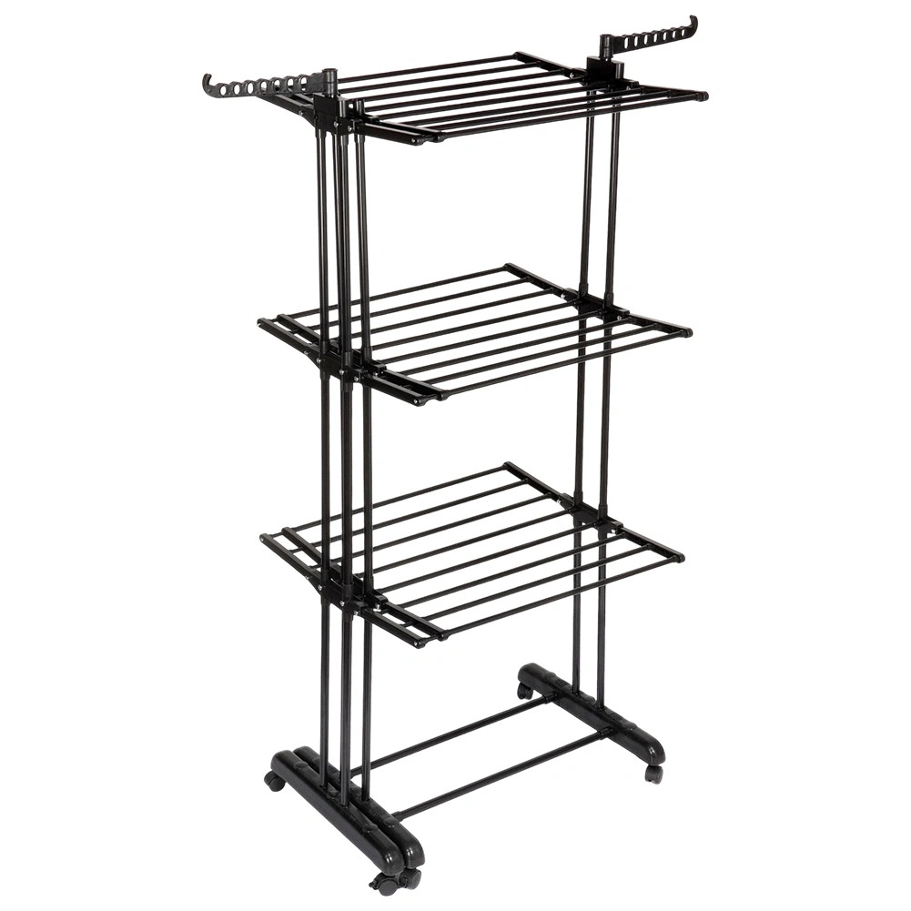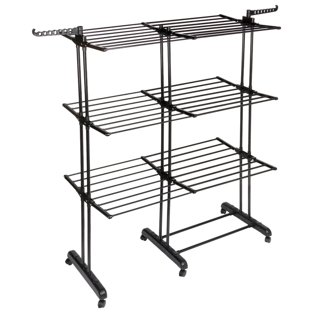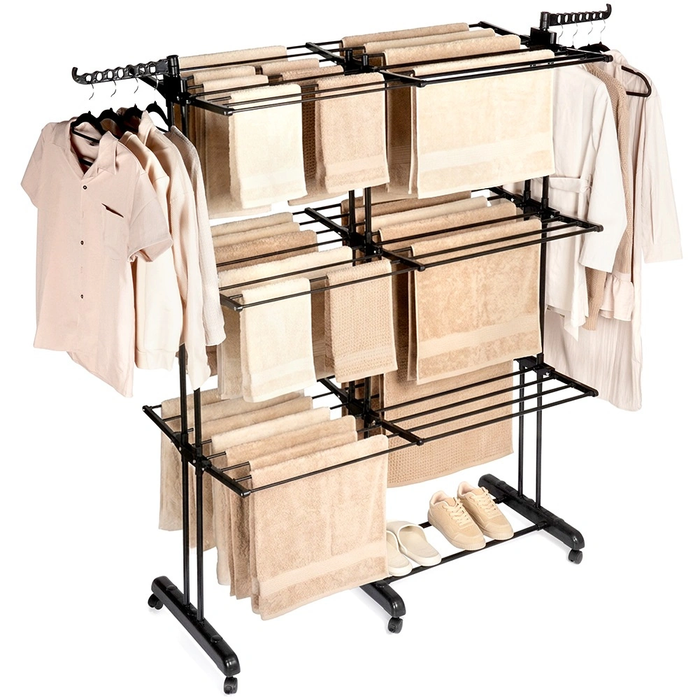 Vertikalno sušilo XXL u elegantnoj crnoj boji idealno je za stan, praonicu i balkon. Tri neovisne razine i šest zasebno sklopivih krila omogućuju prilagodbu prostoru, duljini i količini rublja. Sa strane se nalaze ruke s otvorima za vješalice, a dolje praktična polica, primjerice za obuću.