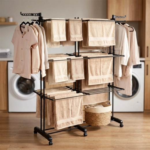 Šest neovisnih sklopivih krila i bočne ruke za vješalice maksimalno povećavaju kapacitet bez kompromisa u protoku zraka.