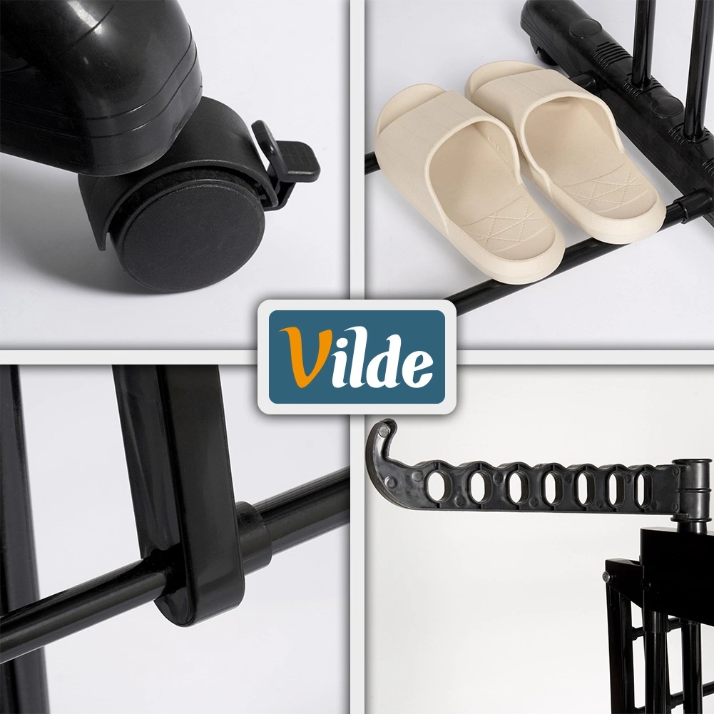 Robustan okvir od praškasto lakiranog metala otporan je na vlagu i zahvaljujući debelim šipkama ne deformira se pod opterećenjem. Teleskopska širina 75–135 cm štedi prostor, dok 6 kotačića (3 s kočnicom) omogućuje lako premještanje i sigurno fiksiranje na mjestu.