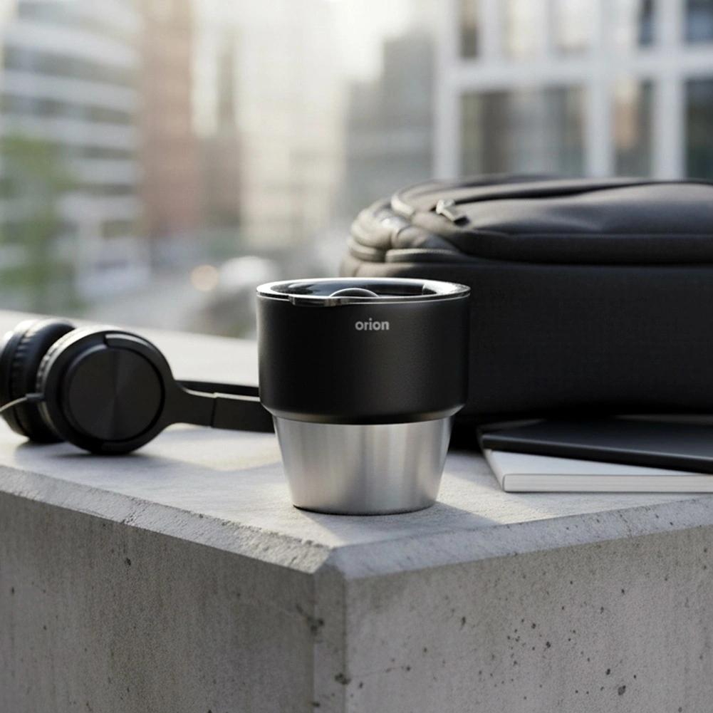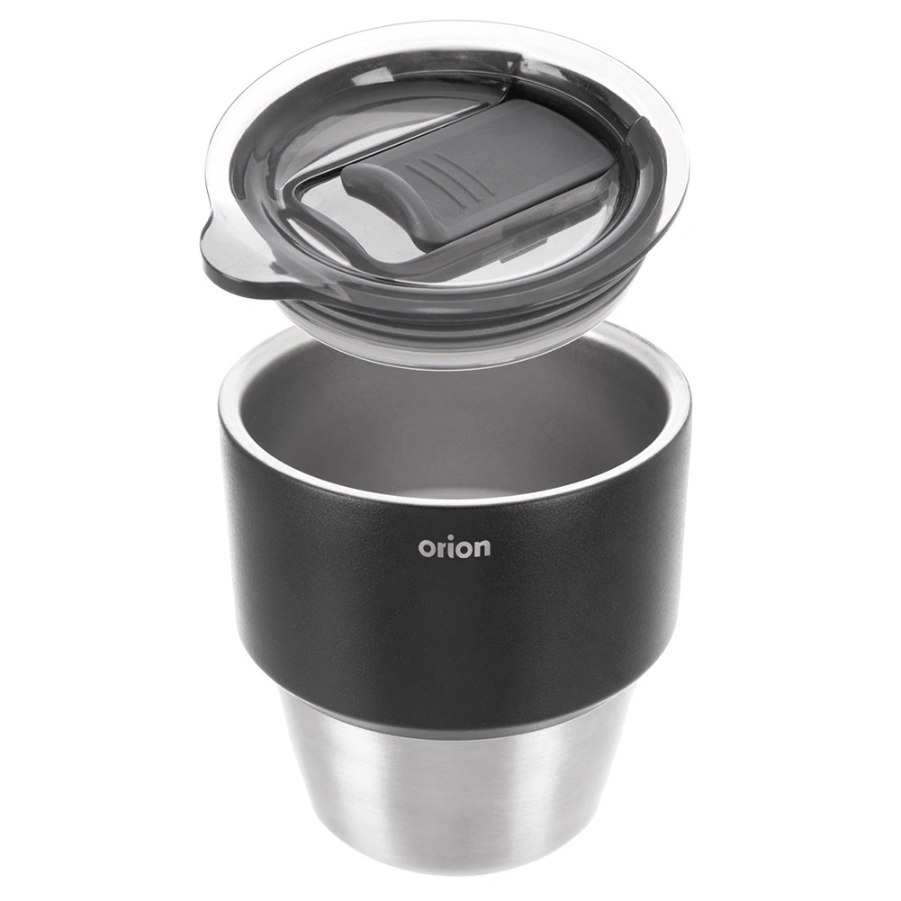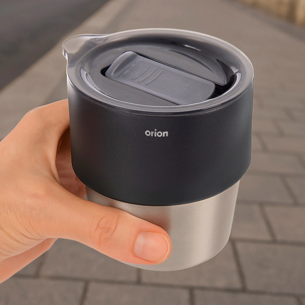 Unutarnji dio izrađen je od kvalitetnog nehrđajućeg čelika, vanjski iz kombinacije nehrđajućeg čelika i izdržljive plastike u crnoj boji. Poklopac s kliznim otvorom omogućuje udobno ispijanje i minimalizira rizik od prolijevanja – idealno za auto i gradski tempo. Za najbolje rezultate šalicu prije upotrebe zagrijte vrućom vodom (za tople napitke) ili ohladite hladnom (za hladne napitke).