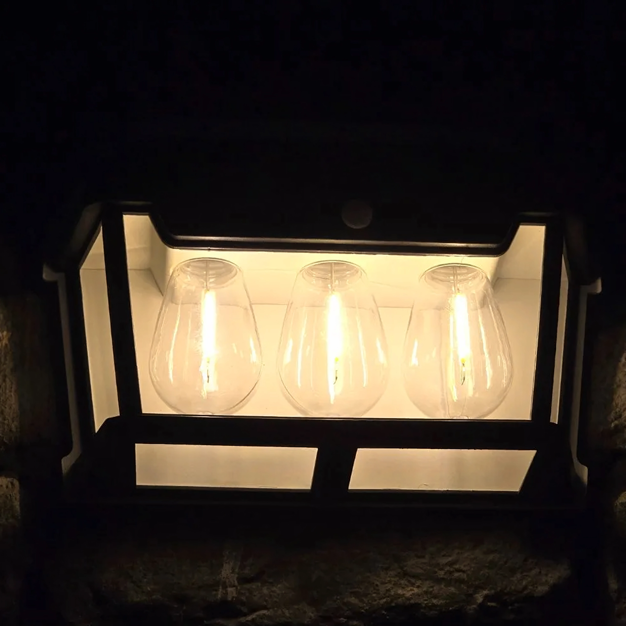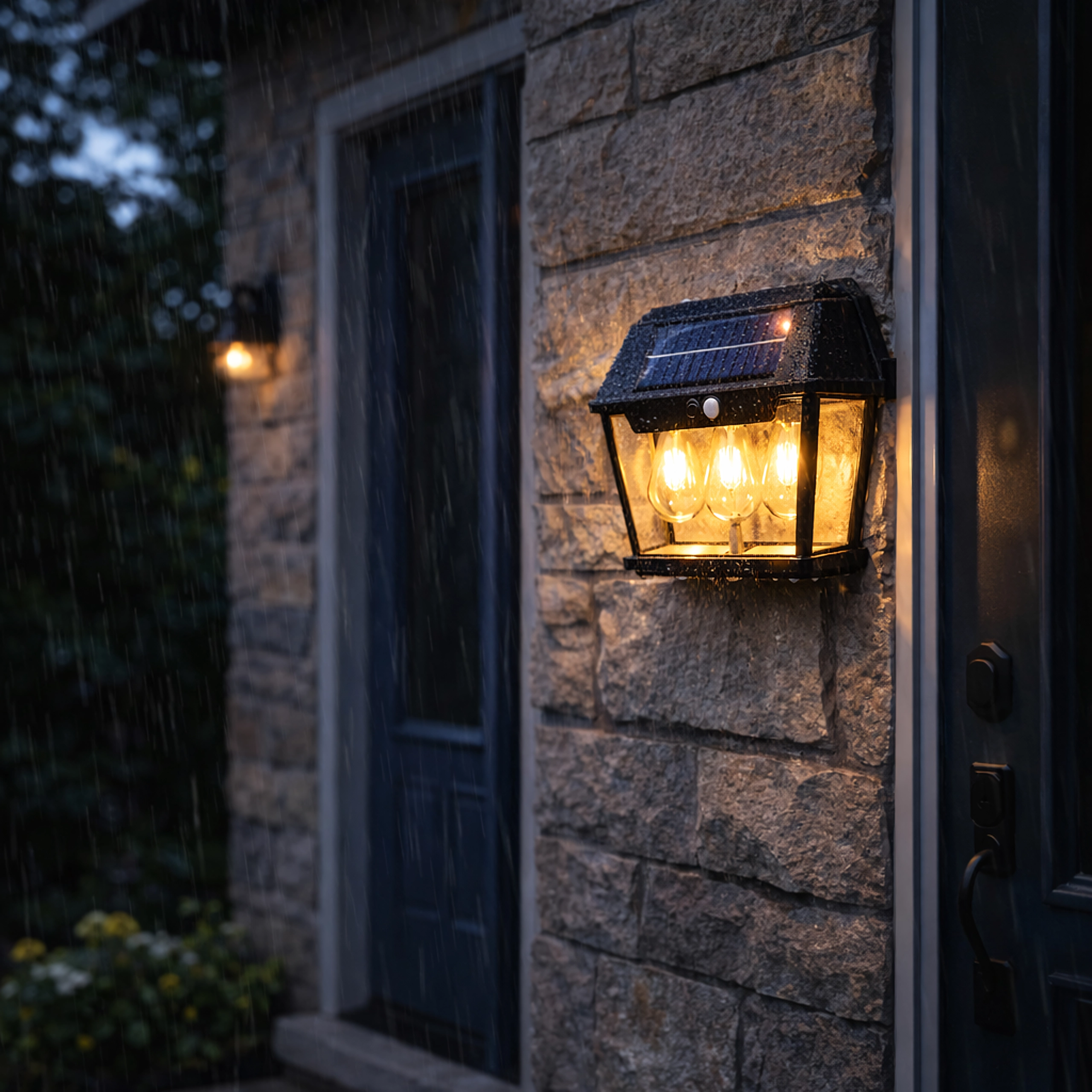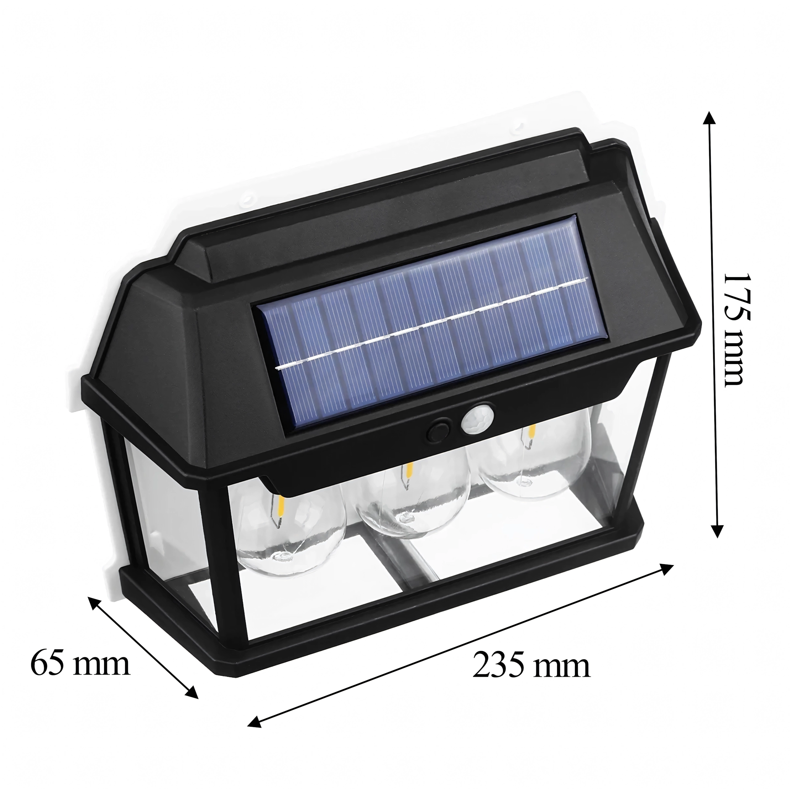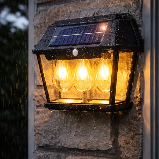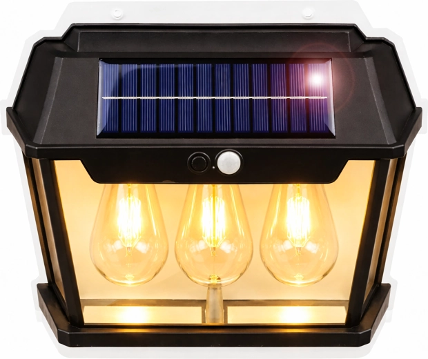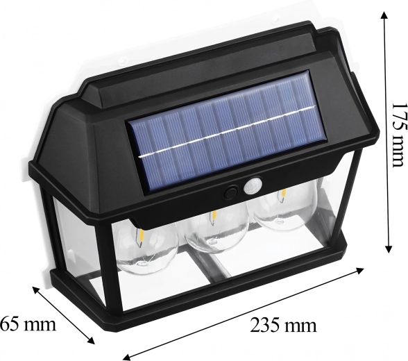Elegantna solarna zidna svjetiljka u stilu lanterne s tri LED izvora osigurava automatsko osvjetljenje bez kabela. Integrirani solarni panel tijekom dana se puni, a navečer aktivira štedljivo toplo svjetlo koje se pri detekciji pokreta pojačano uključi. Izdržljiva konstrukcija prikladna je za vanjsku uporabu na fasadama, terasama, balkonima ili ulazima.